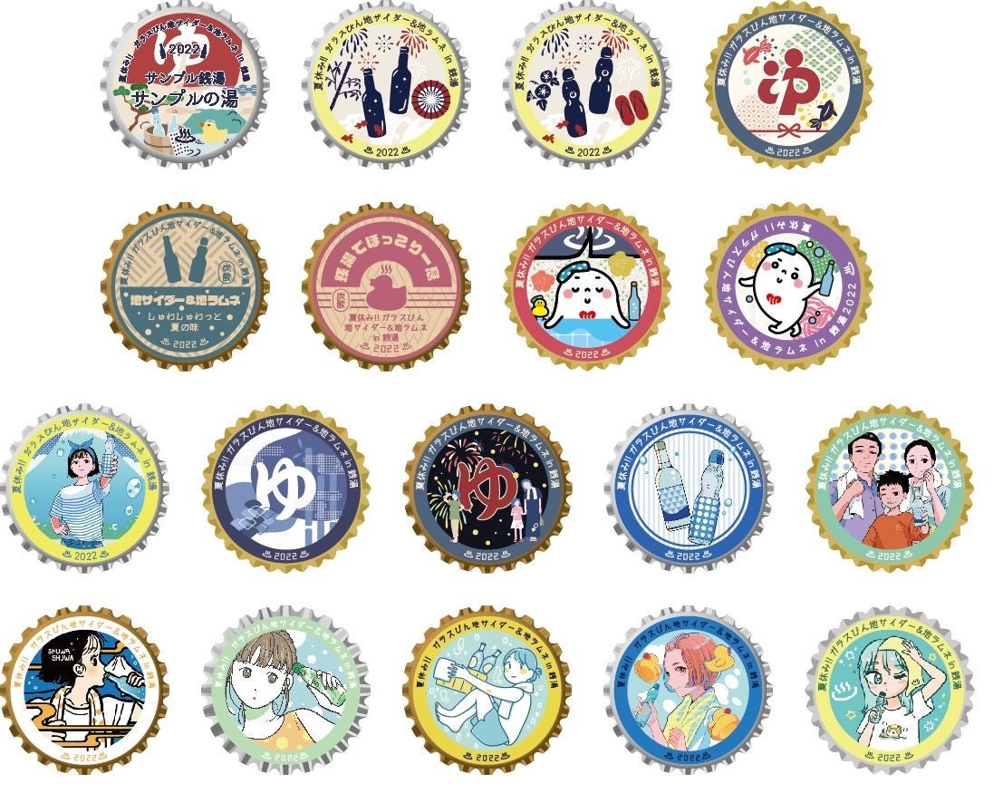開催期間中、「ガラスびん入り地サイダー&地ラムネ」を1本ご購入ごとにスタンプを1個、スタンプ3個で限定王冠風コラボバッジ1セット(2個)をプレゼントします。コラボバッジは、ガラスびんの象徴ともいえる王冠をモチーフに「ガラスびん」、「地サイダー&地ラムネ」、「銭湯」、「参加銭湯の屋号」がデザインされた17種類の缶バッジにより構成されています。