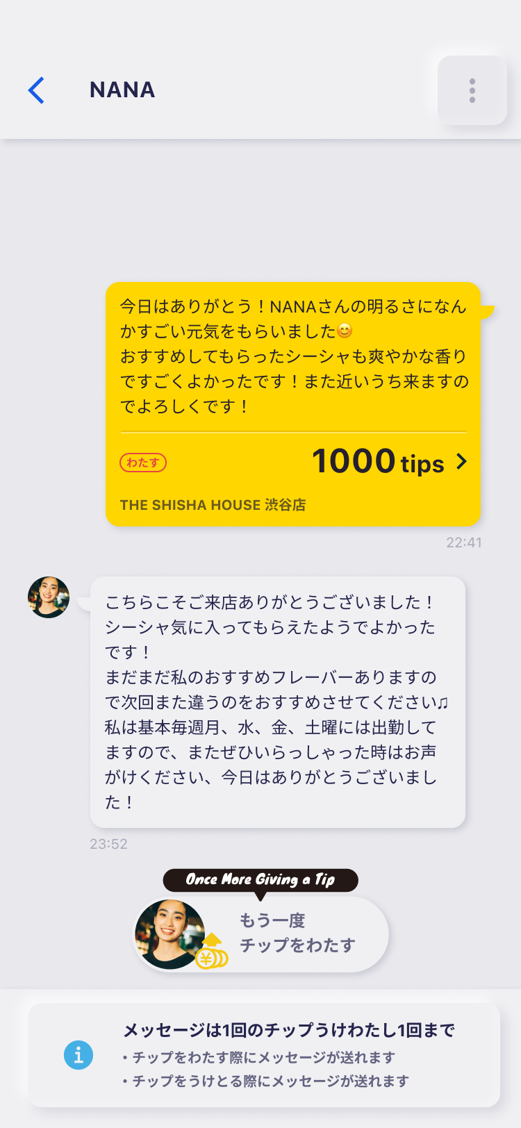 今回の実証実験でより多くチップを渡されたのは男性だった。より多くのチップを受け取ったスタッフ数名にインタビューすると、チップと一緒にもらったメッセージ内容としては感謝の文面「ありがとう」や定型文を利用したメッセージもあるが、どちらかというと「頑張ってね」や「またよろしくね」などの応援メッセージが多い事が判明し、頑張って元気に明るく働いている姿に対し、応援の意味を込めてチップを渡されることが多いことがわかった。このことにより、スタッフの接客テクニック・ノウハウよりも頑張る姿に共感を持たれチップを渡されることが多いことがわかる。また本アプリにより、その頑張りを可視化することができるとわかった。