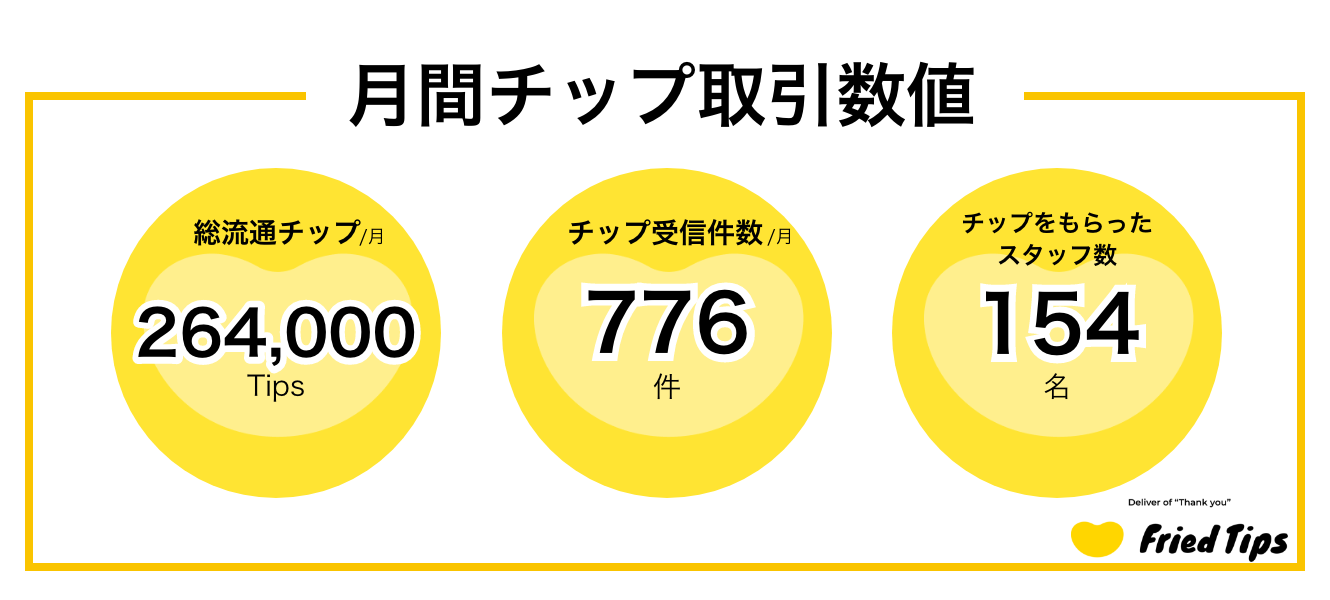 今回の取り組みでは、フライドチップスを導入しているセクションエイトが運営する各店舗にて「チップの流通金額」「チップ受け渡しの回数」「チップを受け取ったスタッフの人数」「スタッフ個人の月額最高金額」「店舗別の流通チップ数」を計測しました。
