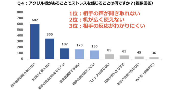 ・アクリル板へのストレスで多いのは「相手の声が聞き取れない」「机が広く使えない」「相手の反応がわかりにくい」があげられる。 - 結果
