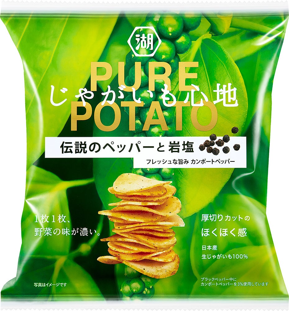本商品は、「カンポートペッパー」の芳醇でフレッシュな旨み、柑橘のような爽やかなキレと岩塩の組み合わせで、じゃがいも本来の旨みが際立つ、新感覚のペッパーフレーバーです。『PURE POTATO じゃがいも心地』シリーズの新たなラインナップとしてふさわしい、じゃがいも本来の濃い味わいを爽やか&スパイシーに引き立てる、1枚1枚かみしめたくなるような味わいに仕上げました。これまでのペッパーとはひと味ちがう、まさにこの暑い夏にピッタリな味わいです。