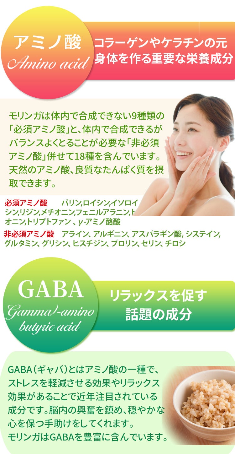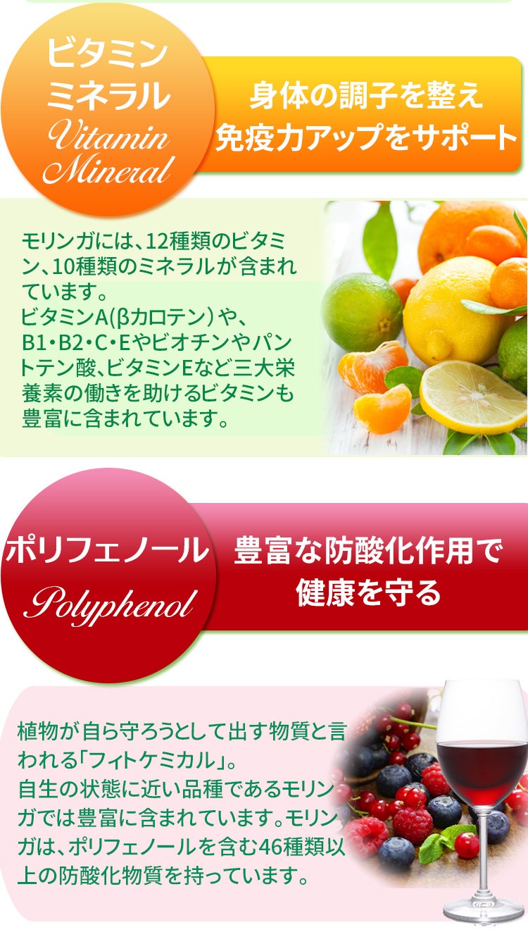 ・モリンガには、ビタミンAとビタミンC、β-カロテン、カルシウム、カリウム、鉄、タンパク質、シスチン、メチオニン、トリプトファン、リジンなどのアミノ酸が含まれています。 いずれも健康な体づくりに欠かせない栄養成分です。