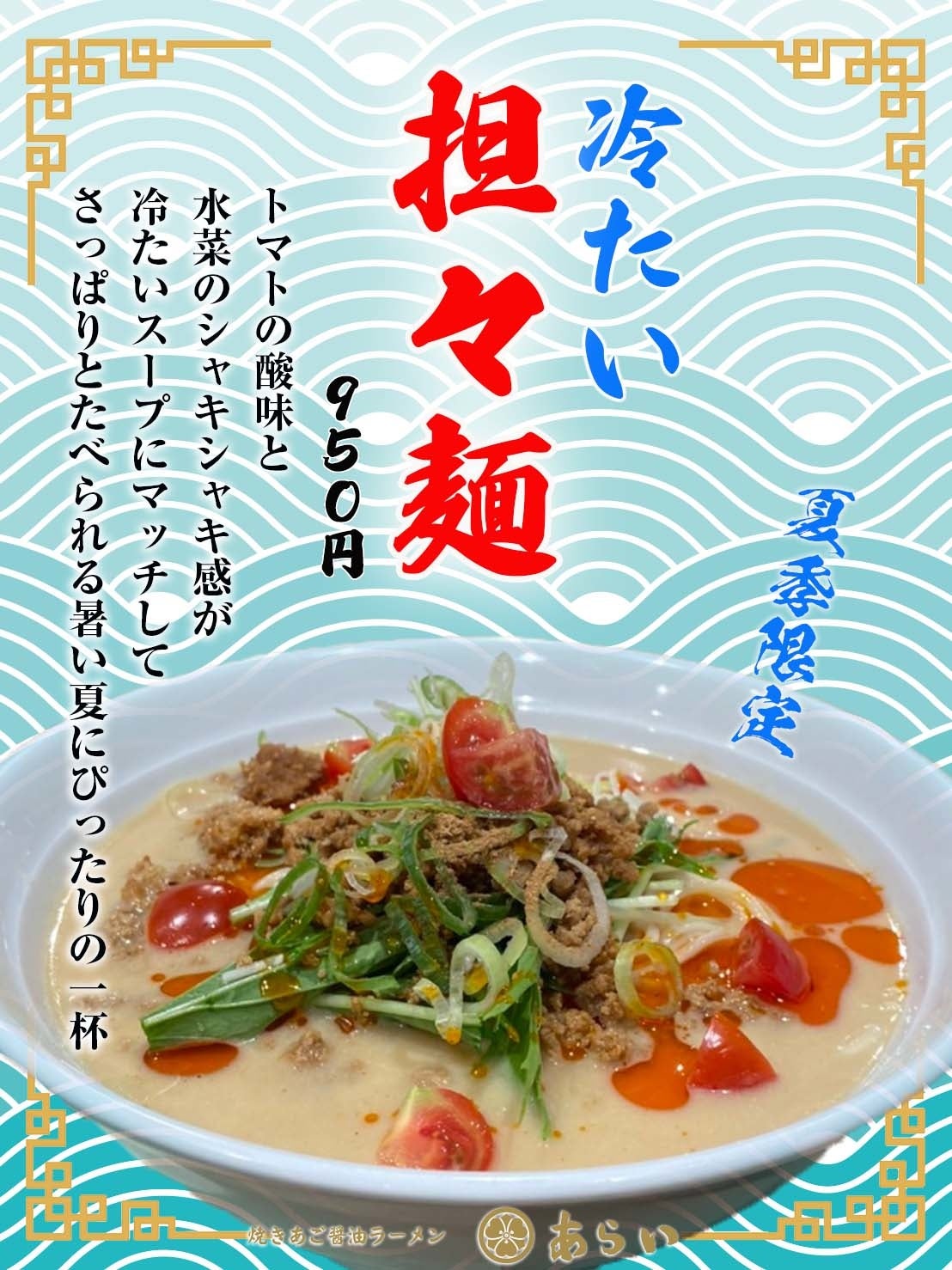 株式会社RAVIPA飲食事業部(本社:東京都豊島区 代表取締役:新井亨)の運営するラーメンあらいイオンスタイル板橋前野町店では、冷やし坦々麺の販売を開始!