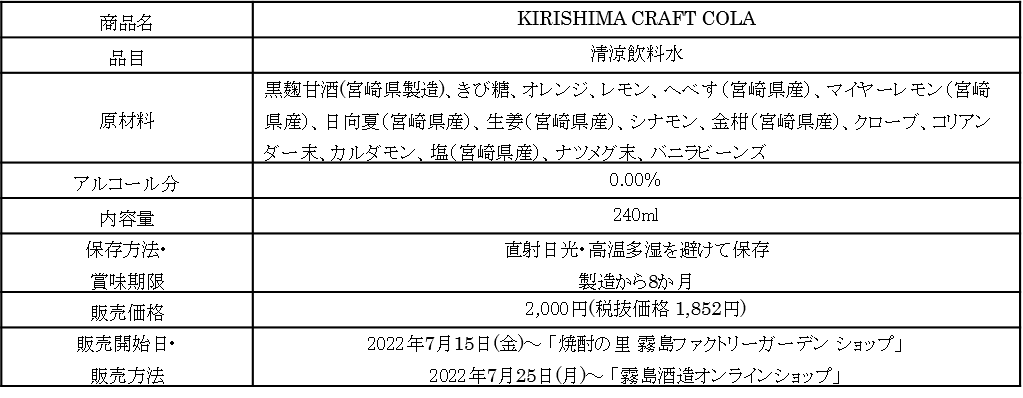 霧島酒造株式会社(代表取締役社長:江夏順行、本社:宮崎県都城市下川東4丁目28号1番)は、黒麹甘酒を使用したクラフトコーラシロップ『KIRISHIMA CRAFT COLA(霧島クラフトコーラ)』を2022年7月15日(金)より「焼酎の里 霧島ファクトリーガーデン ショップ」にて数量限定で販売いたします。また2022年7月25日(月)からは、「霧島酒造オンラインショップ」でも数量限定で販売いたします。