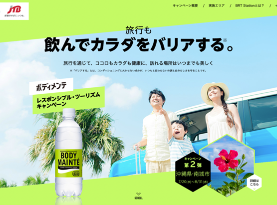 大塚製薬株式会社(本社:東京都、以下「大塚製薬」)と、株式会社JTB(本社:東京都、以下「JTB」)は、旅行者に健康で楽しい旅行を演出する「ボディメンテ レスポンシブル・ツーリズム(以下BRT)」キャンペーン第2弾を2022年7月20日より沖縄県南城市にて実施します。近年、旅行者も訪問地での地域の生活や環境に配慮した責任ある行動をとる「レスポンシブル・ツーリズム(責任ある観光)」*が注目されています。現在の社会的状況から、旅行者を受け入れる地域や観光関連事業者が様々な対策を講じることに加え、旅行者自身も健康に留意し、双方各場面において行動に責任を持つことが求められています。旅行先でも責任ある行動をとることは、旅先の地域資源である環境や文化、伝統を守り、育むサステナブルツーリズムにも通じます。第2弾では自然環境豊かな沖縄で、より良い観光地形成を考えるレスポンシブル・ツーリズムの一端を体験していただけます。