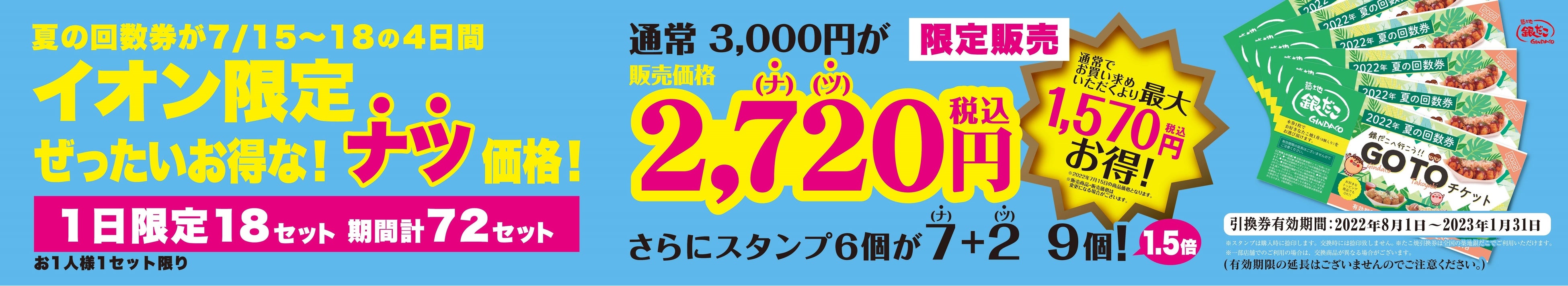 今回は、大人気の “ぜったいお得な” 「夏の回数券 GO TO チケット」 を、「イオン 超!ナツ夏祭り」の限定商品として 『6枚入りセットを、各店各日18セット限定』 でご用意! さらに!ご購入時に銀だこスタンプカードのスタンプが通常回数券の枚数分(6個)のところ、7(ナ) + 2(ツ) = 9個もらえる特別企画!※8の付く日に購入すると、スタンプ2倍!※1 で、 “さらにお得” !!!