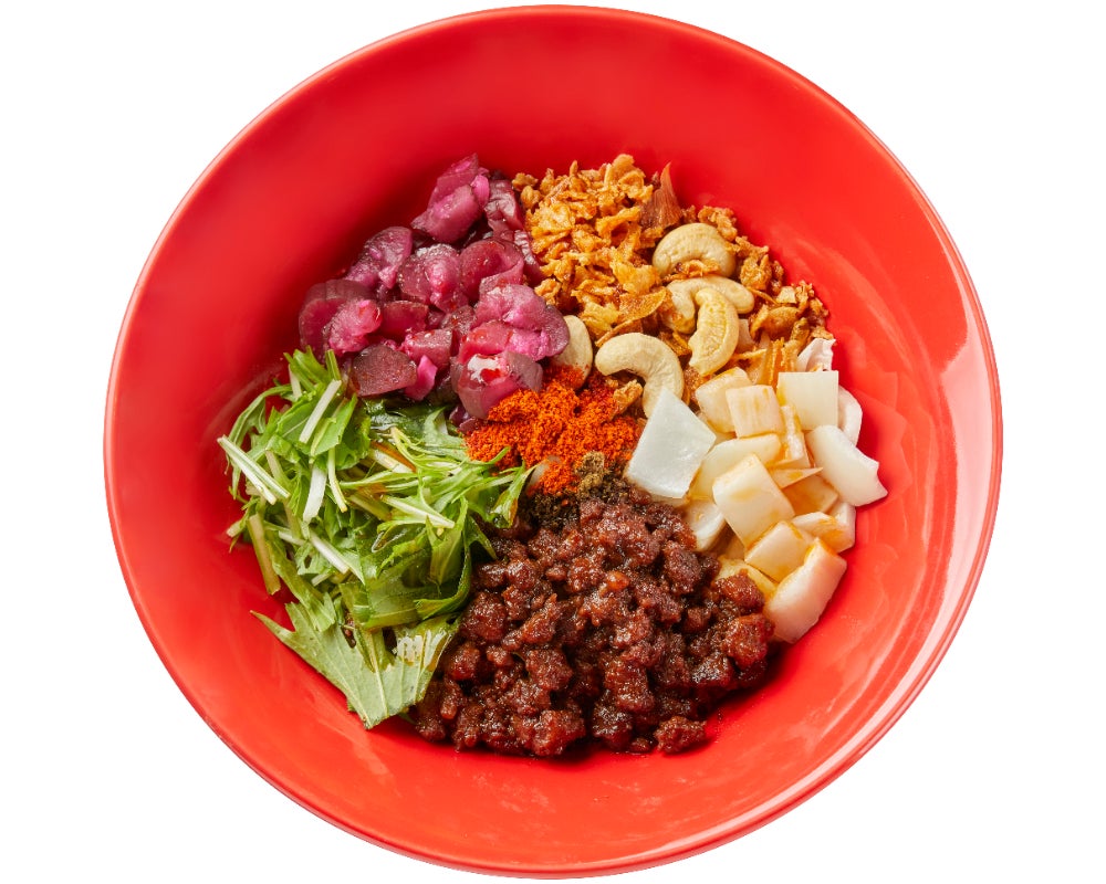 トッピングには、神⼾ポークを使った⾁ミンチ、インドから取り寄せているカシューナッツ、⽢味のある淡路島産の⽟ねぎ、そして絶妙な味わいを醸し出す柴漬けなど。卓上のオレンジ酢やエキゾチック酢、煮⼲し酢、スパイス辣油で味変もお楽しみいただけます。