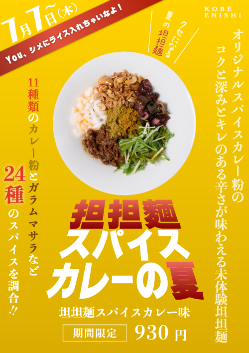 KOBE ENISHI 五反⽥店(東京都品川区)では7⽉7⽇(金)より、期間限定メニュー「坦坦麺スパイスカレー」(税込930円)と「濃厚冷やし坦坦麺」(税込930円)の販売をスタートしました。ミシュランビブグルマンを受賞したENISHIの担担麺で「夏を味わえる⼀杯」とされる特別な商品。ENISHI総本店(兵庫県神⼾市)の代表的な味わいを、都内でも期間限定でお楽しみいただけます。