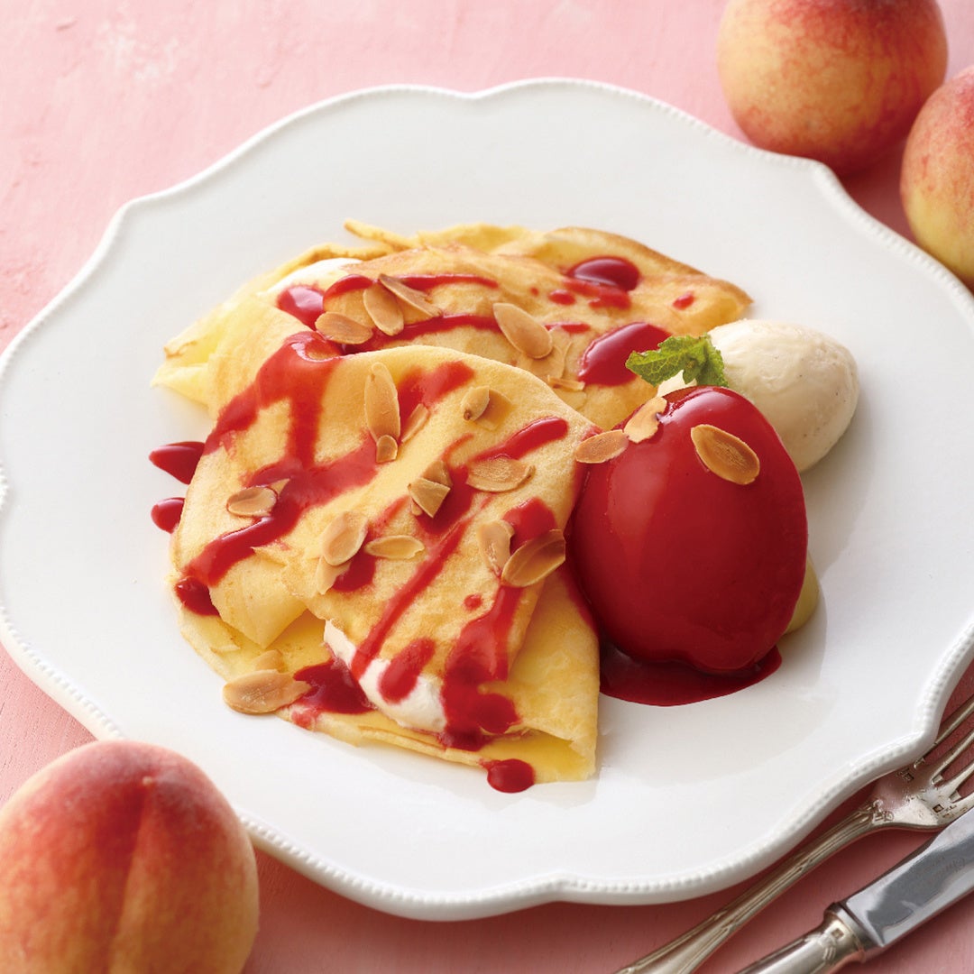 - ジューシーな桃の果肉、冷たいバニラアイスと味わう“自家製クレープ”が新登場