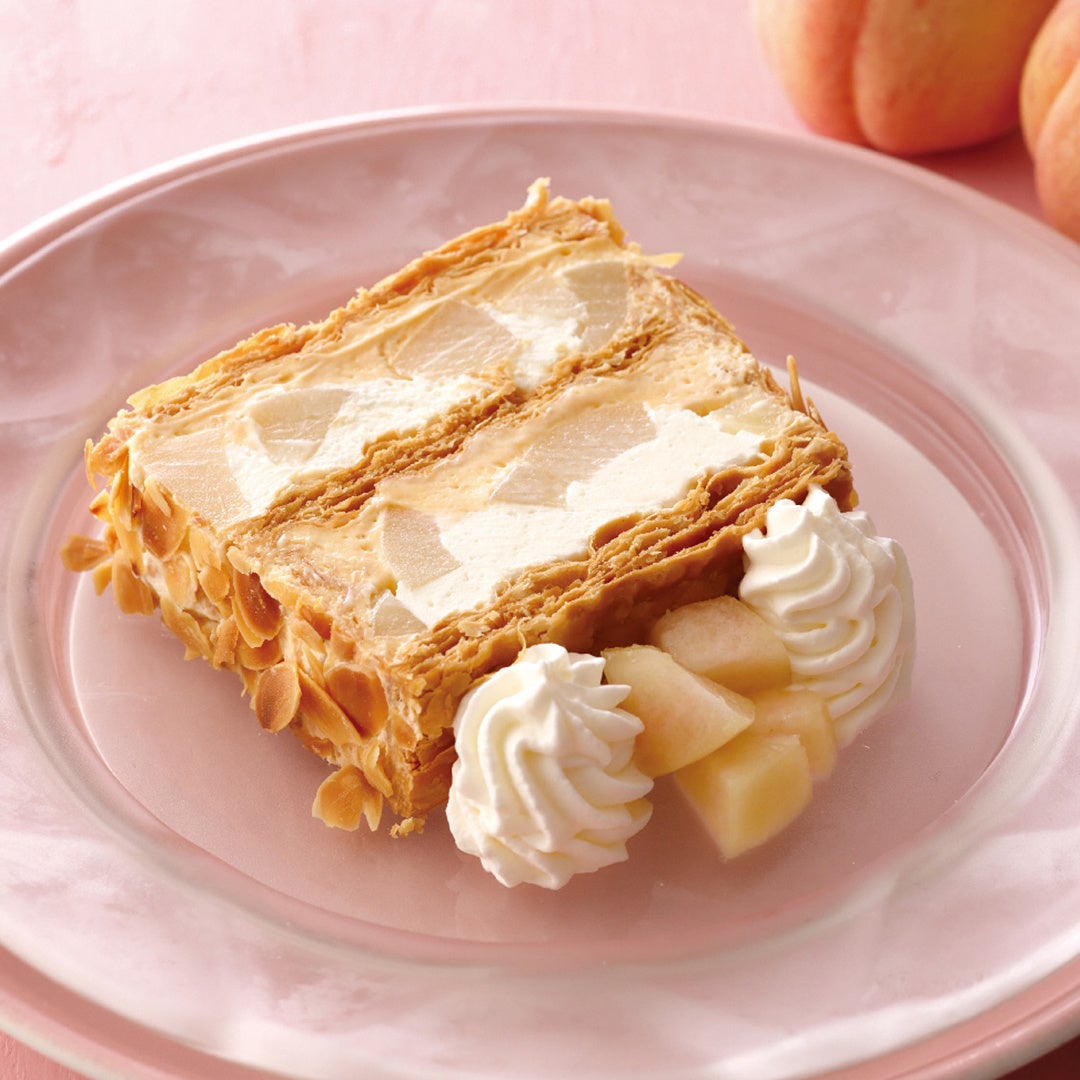 KIHACHIの定番ナポレオンパイを白桃でアレンジ。フレッシュの白桃、サクサクのパイ生地、マスカルポーネクリームとディプロマットクリームを丁寧に重ねました。