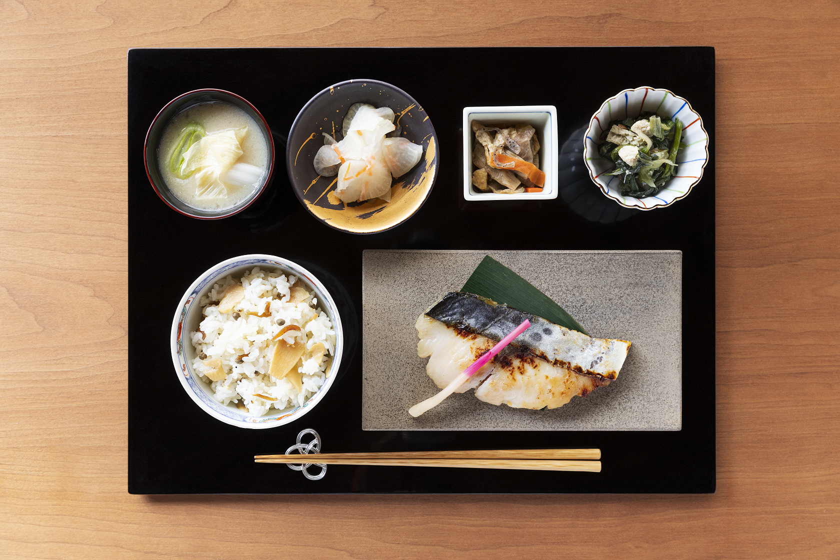 メニュー:①ちりめん竹の子ご飯 ②京さわらの西京焼き ➂京風味噌汁 ④ずいきの炊いたん ⑤大根とゆず皮の甘酢和え ⑥小松菜と京揚げの煮びたし