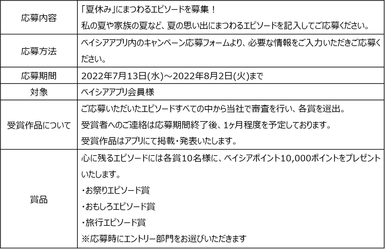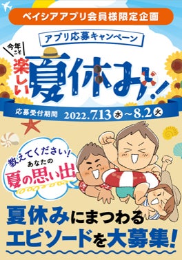 株式会社ベイシア(本社:群馬県前橋市、代表取締役社長:相木孝仁)は、7月13日(水)~8月2日(火)の期間で、「教えてください!あなたの夏の思い出」と題して、「夏休み」にまつわるエピソードをベイシアアプリ内で募集いたします。ご応募いただいたエピソードの中から心に残るエピソード各賞を選出し、賞品としてベイシアポイントをプレゼントいたします。また店内各所では夏休みの日常の一コマをイラストでご紹介し、盛り上げます。ぜひ今年こそ、ベイシアと一緒に夏休みを楽しみましょう。