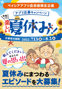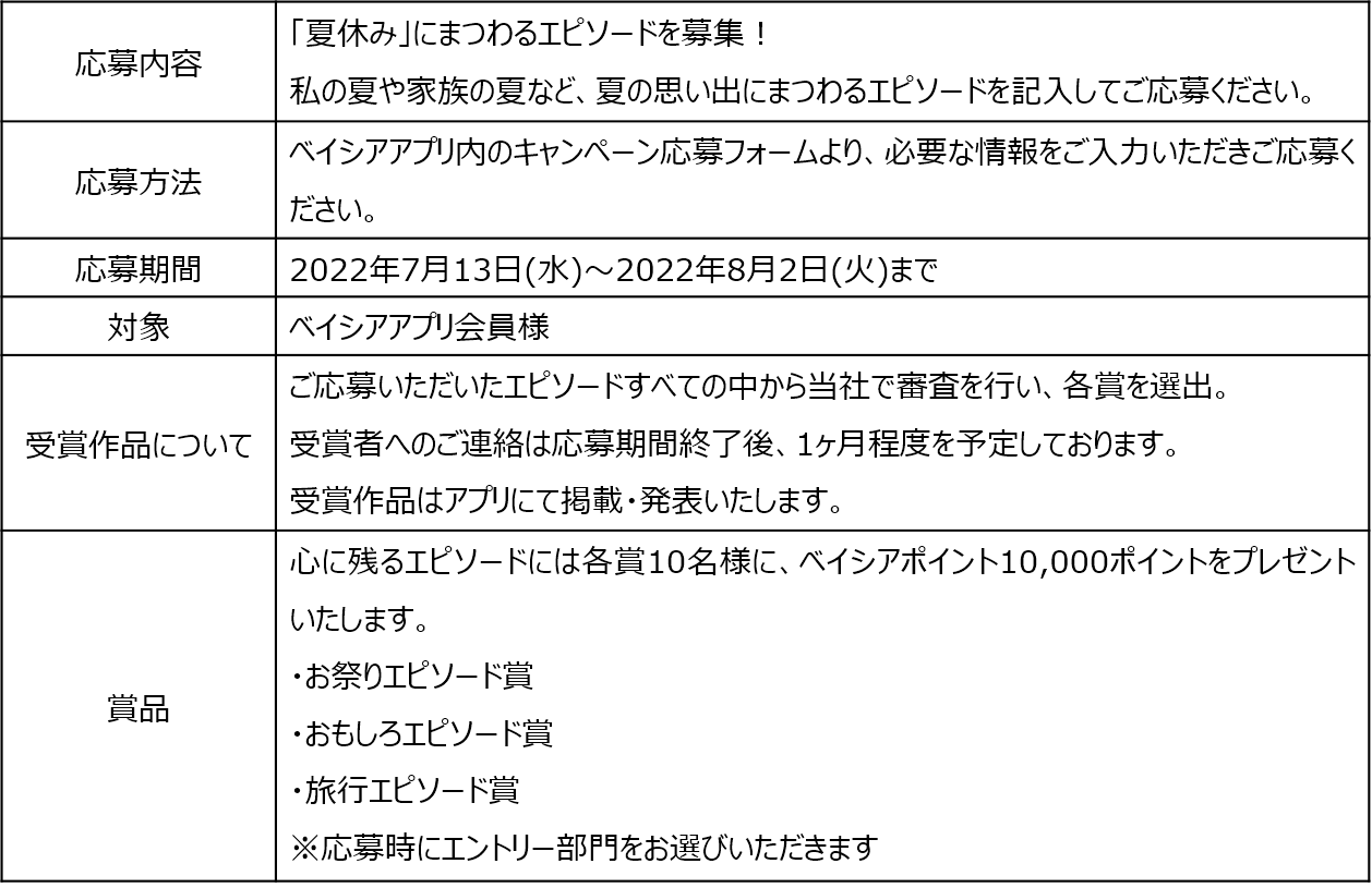 株式会社ベイシア(本社:群馬県前橋市、代表取締役社長:相木孝仁)は、7月13日(水)~8月2日(火)の期間で、「教えてください!あなたの夏の思い出」と題して、「夏休み」にまつわるエピソードをベイシアアプリ内で募集いたします。ご応募いただいたエピソードの中から心に残るエピソード各賞を選出し、賞品としてベイシアポイントをプレゼントいたします。また店内各所では夏休みの日常の一コマをイラストでご紹介し、盛り上げます。ぜひ今年こそ、ベイシアと一緒に夏休みを楽しみましょう。