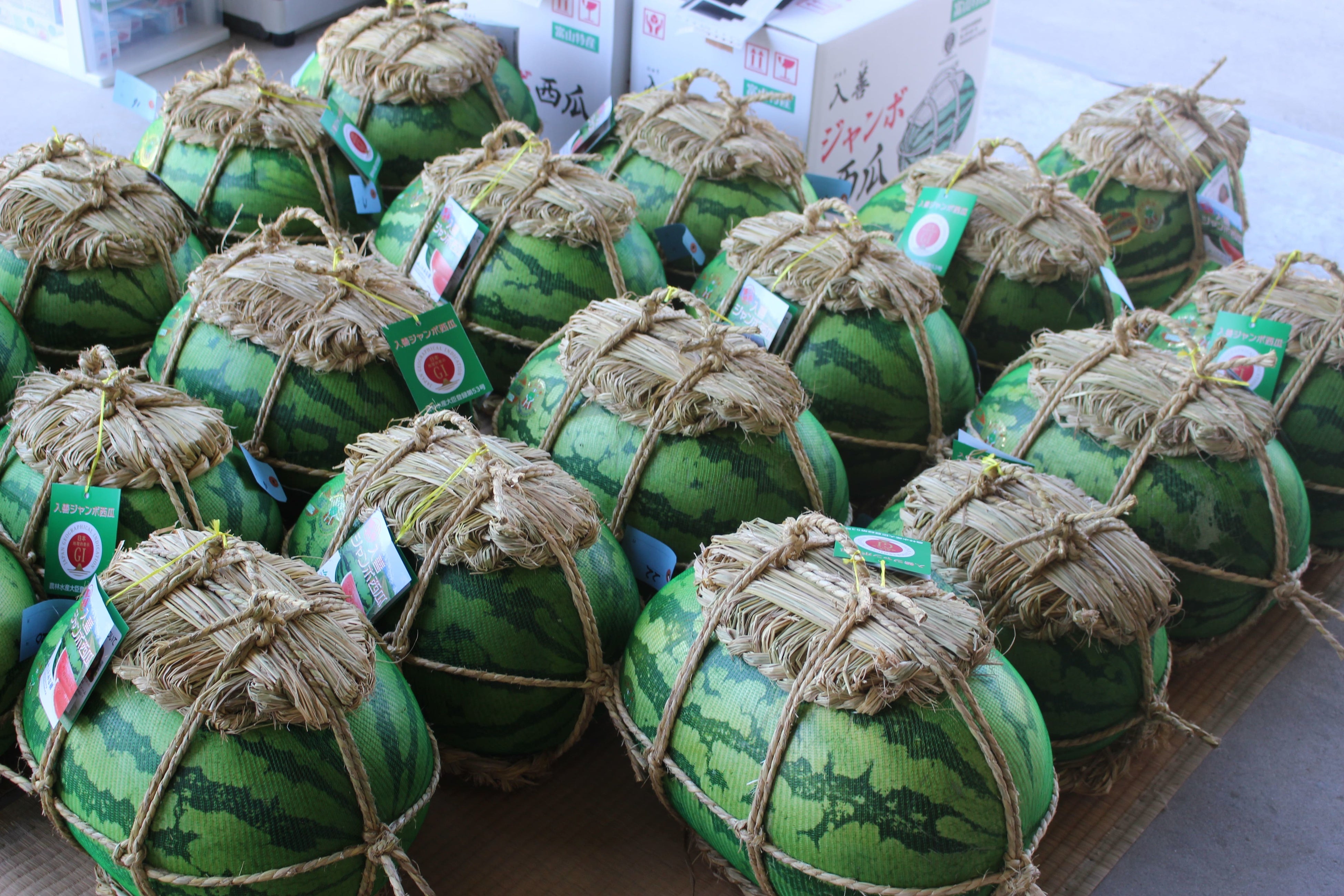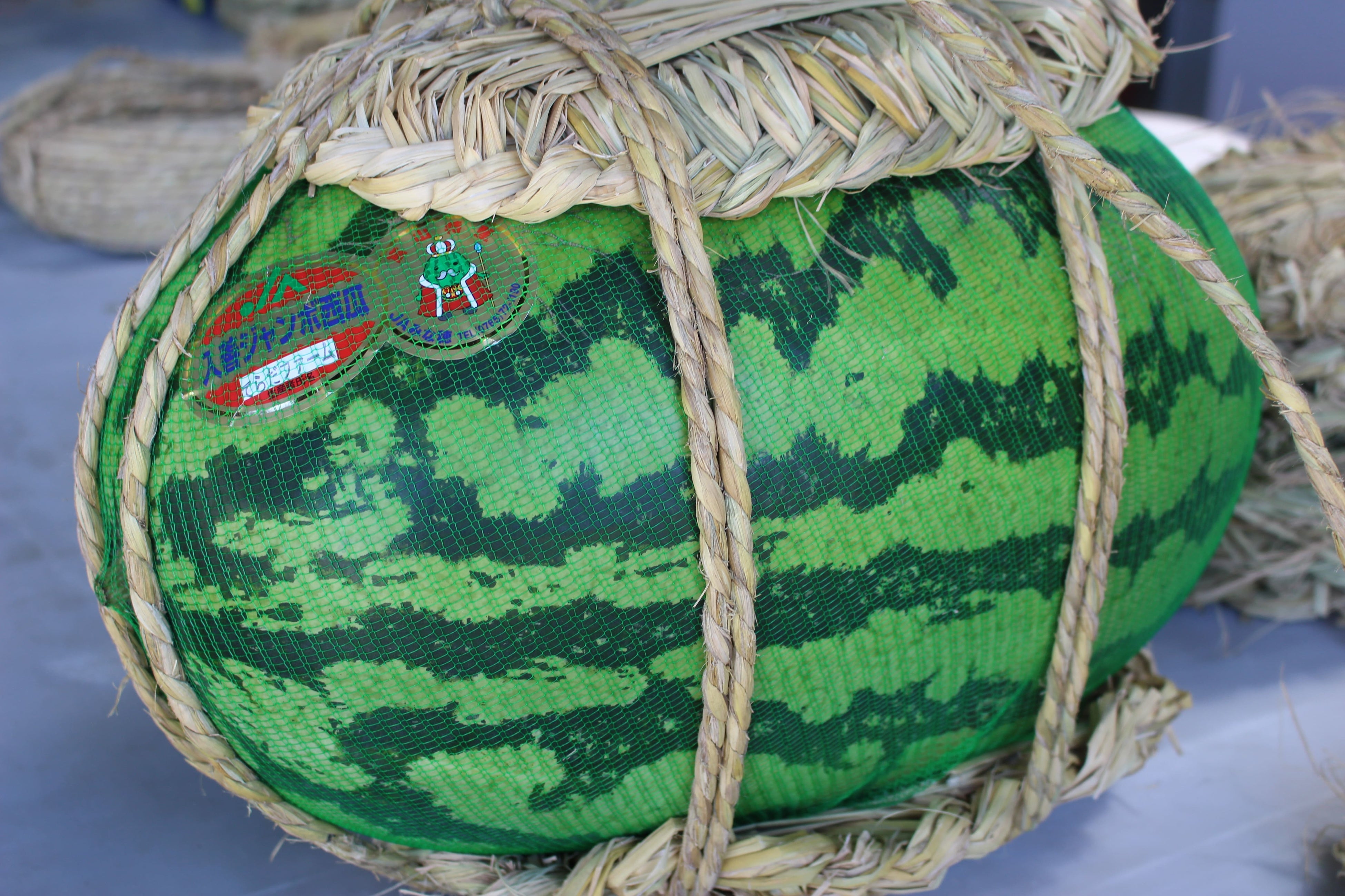 重さ約18kgと、日本一大きな西瓜(すいか)として知られる「入善ジャンボ西瓜(にゅうぜんじゃんぼすいか)」(一般的な大玉西瓜は約7~9kg)。黒部川扇状地の恵まれた自然環境と豊富な湧水により育てられ、大きいものでは重さ30kgになります。ラグビーボールのような楕円形が特徴的で、平均的なサイズは、長さ42cm、直径30cmほどです。