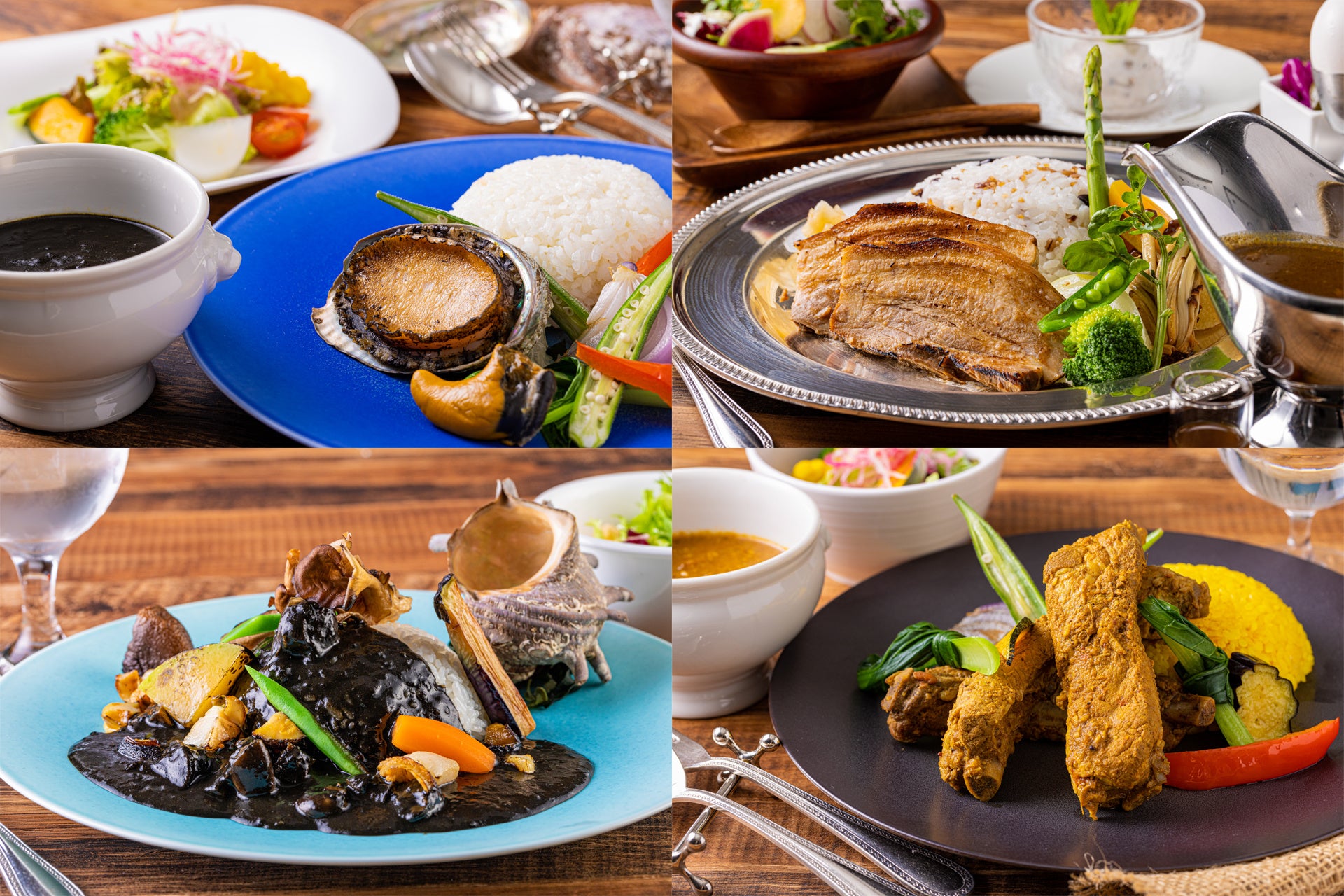 ホテルシェフによる趣向を凝らしたアレンジでカレーをお楽しみいただける、期間限定のカレーフェアです。カレーは海鮮系とポーク系で2種類ずつ、合計4種類ご用意いたしました。海鮮カレーはあわびとさざえ を中心に、イカ墨でコクを出した風味豊かなカレーです。ポークカレーはチャーシューとポークビンダルー。ボリュームのあるお肉にしっかりと味をつけながらも、どちらも箸でほぐれる柔らかさでお子様でも食べやすいカレーです。