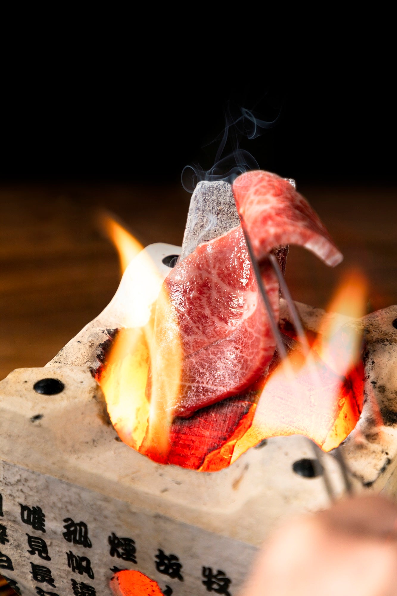 こだわりの「上土佐備長炭」は、通常の備長炭より硬質で高密度。火力が強く三倍の火持ちがあるため鰻料理店や、高級料理店などで使用される、品質が認められた国産高級炭。お肉を片面3秒!備長炭につけるとジュっと焼ける音と芳しい匂いが漂います!