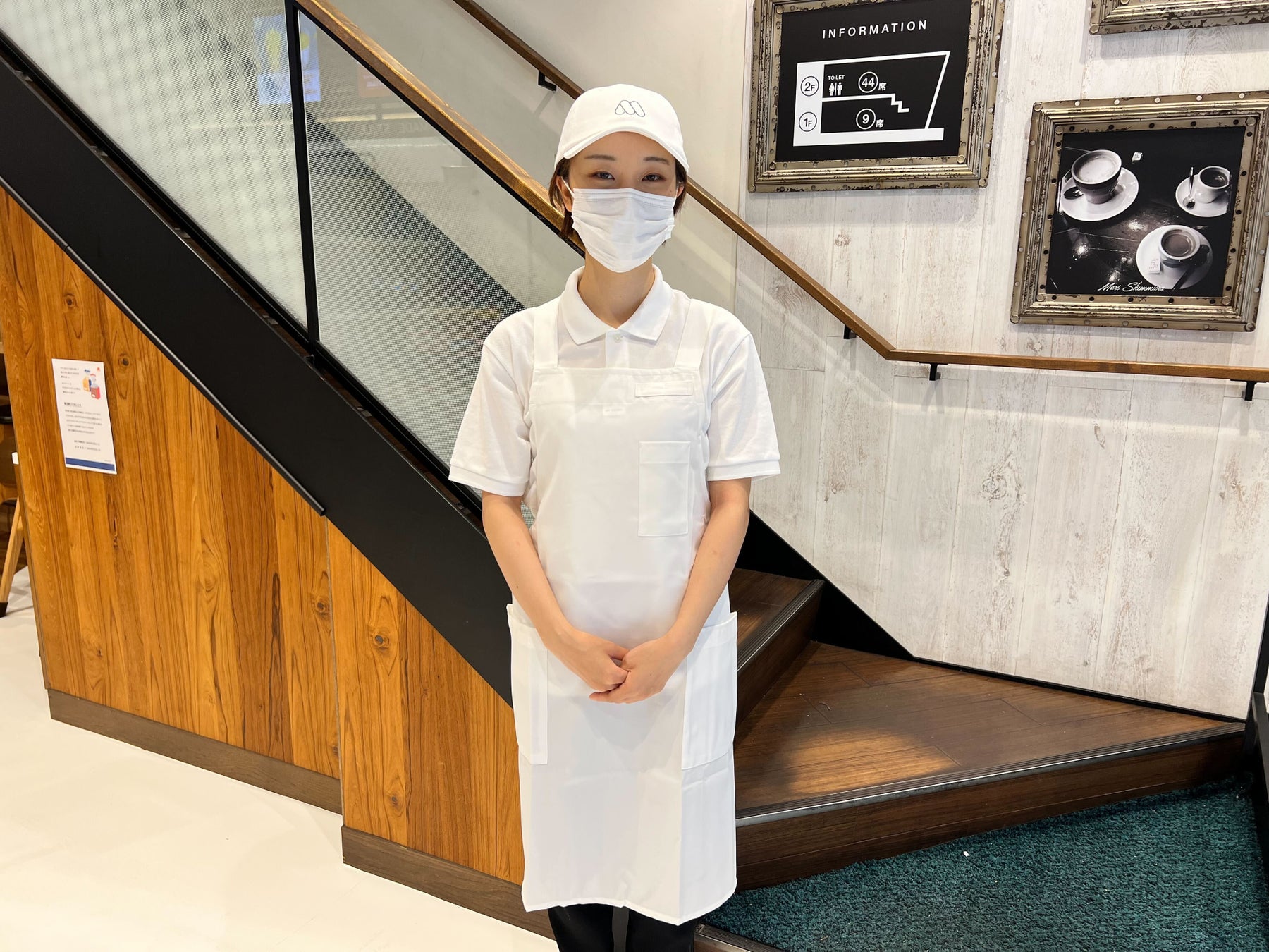 従来のデニム風のエプロンが特徴的なモスバーガーの制服から、「白モス 恵比寿東店」の白く装飾された店内に溶け込むよう、期間限定で”真っ白”に変更。帽子も、シャツも、エプロンも白い、モス史上初のカラーリングとなっています。※一部スタッフは従来の制服を着用している場合がございます