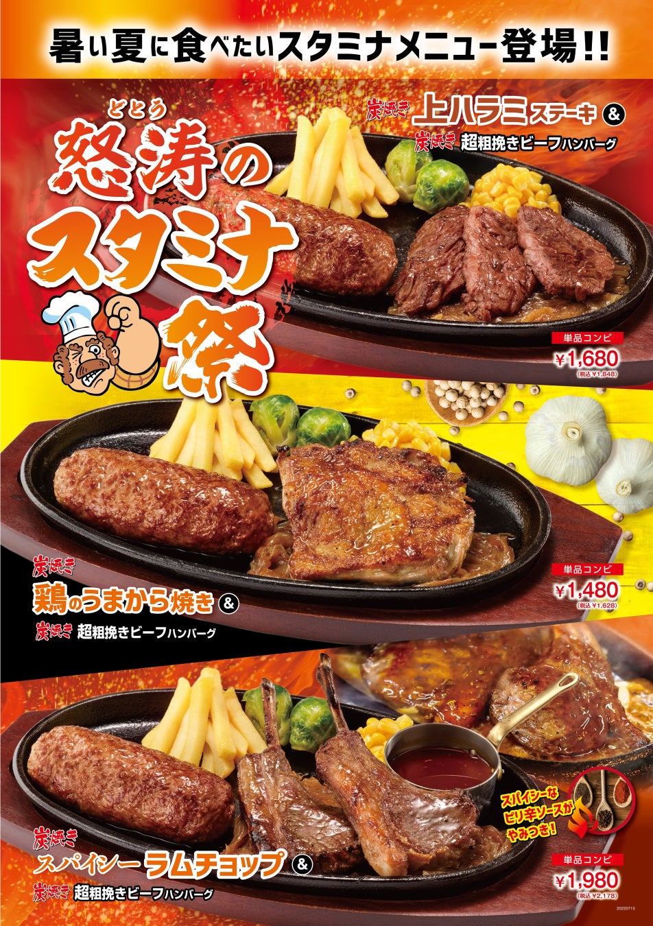 株式会社ブロンコビリー(本社:愛知県名古屋市 代表取締役社長:竹市 克弘)は、7月15日(金)~8月8日(月)を『怒涛のスタミナ祭』として、人気No1の「炭焼き超粗挽きビーフハンバーグ」と牛・鶏・羊のお肉とのコンビメニューを、全131店舗にて期間限定で提供を開始します。コンビの相棒は、本フェアより新登場の「炭焼き上ハラミステーキ」「炭焼き鶏のうまから焼き」「炭焼きスパイシーラムチョップ」の3商品です。段々と暑さが厳しくなっていく今、ブロンコビリーの夏グルメでパワーチャージ!『怒涛のスタミナ祭』の限定メニューを、お楽しみください。URL: http://www.bronco.co.jp/