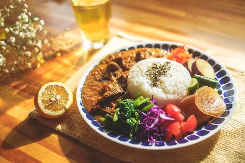 希少な北海道産の羊の骨肉をじっくりと煮込み、十数種類のスパイスを加えて作った無添加カレーです。羊の臭みがまったくなく、やさしい甘みと芳醇な香りのカレーをお楽しみ頂けます。付け合わせの野菜も、一品ずつ素材の味が引き立つように調理をしており、こちらも無駄な調味料を加えずに極力シンプルに仕上げています。