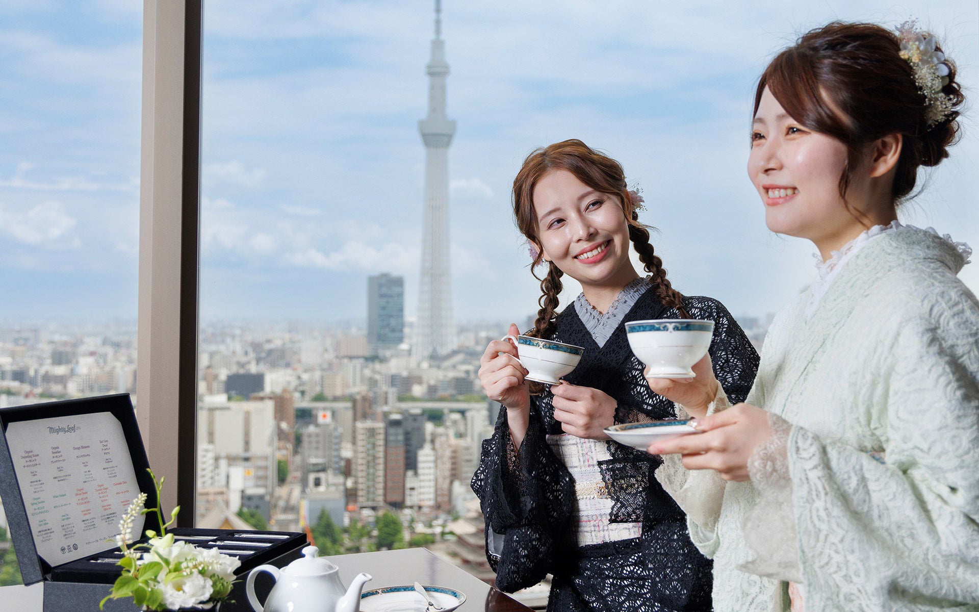 そんな浅草の街を、レトロモダンの浴衣で散策。眺望抜群のホテル最上階で、はんなりと贅沢に和テイストのアフタヌーンティーを味わう。