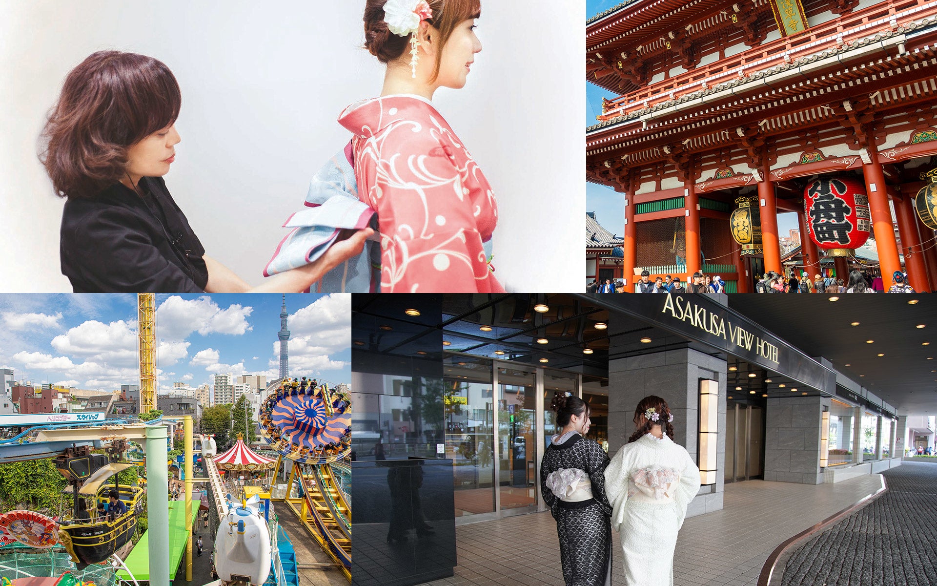 10:00 浴衣レンタル店で着付→11:00 浅草を自由散策開始→14:00 浅草ビューホテルアフタヌーンティー→16:00 ホテル内フォトジェニックスポットを楽しむ→17:30 浴衣レンタル店へ浴衣を返却。
