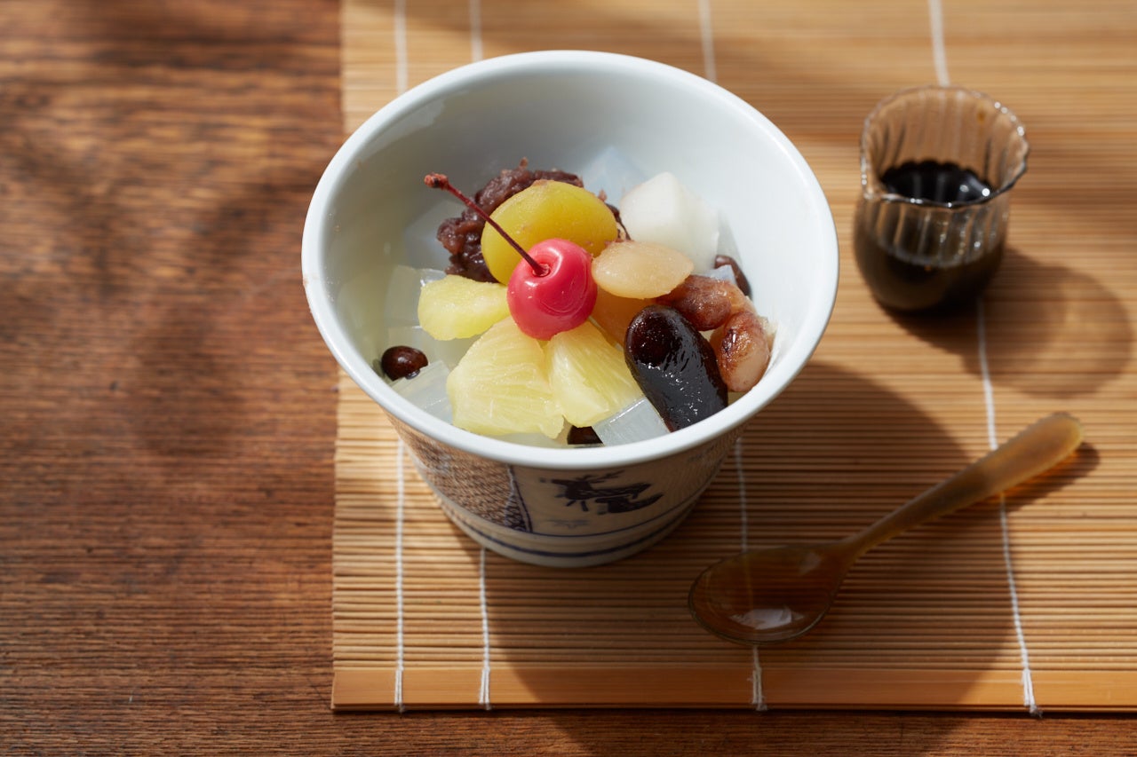 東京・湯島で100年以上にわたり季節の甘味を届ける<みつばち>のあんみつ。みずみずしい口当たりの伊豆産観点と心地よい塩気の赤えんどう豆、北海道産小豆を使用した自家製のこし餡に濃厚でとろりとした黒蜜がマッチしたあんみつです。