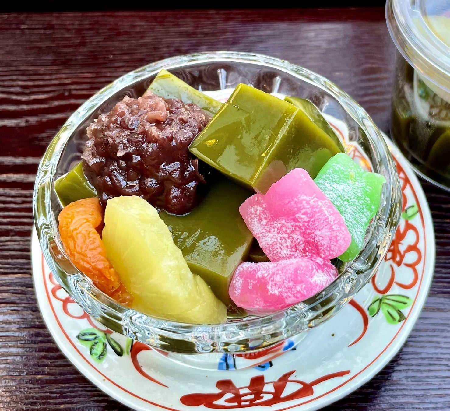 プルプル食感の抹茶くず餅が入ったカラフルなあんみつがお目見えします。宇治の一番摘み抹茶を使用したくず餅に、求肥餅と北海道産の小豆による小倉餡、干し杏、パイナップルを添え、仕上げに別添えの黒蜜をかけてお召し上がりください。
