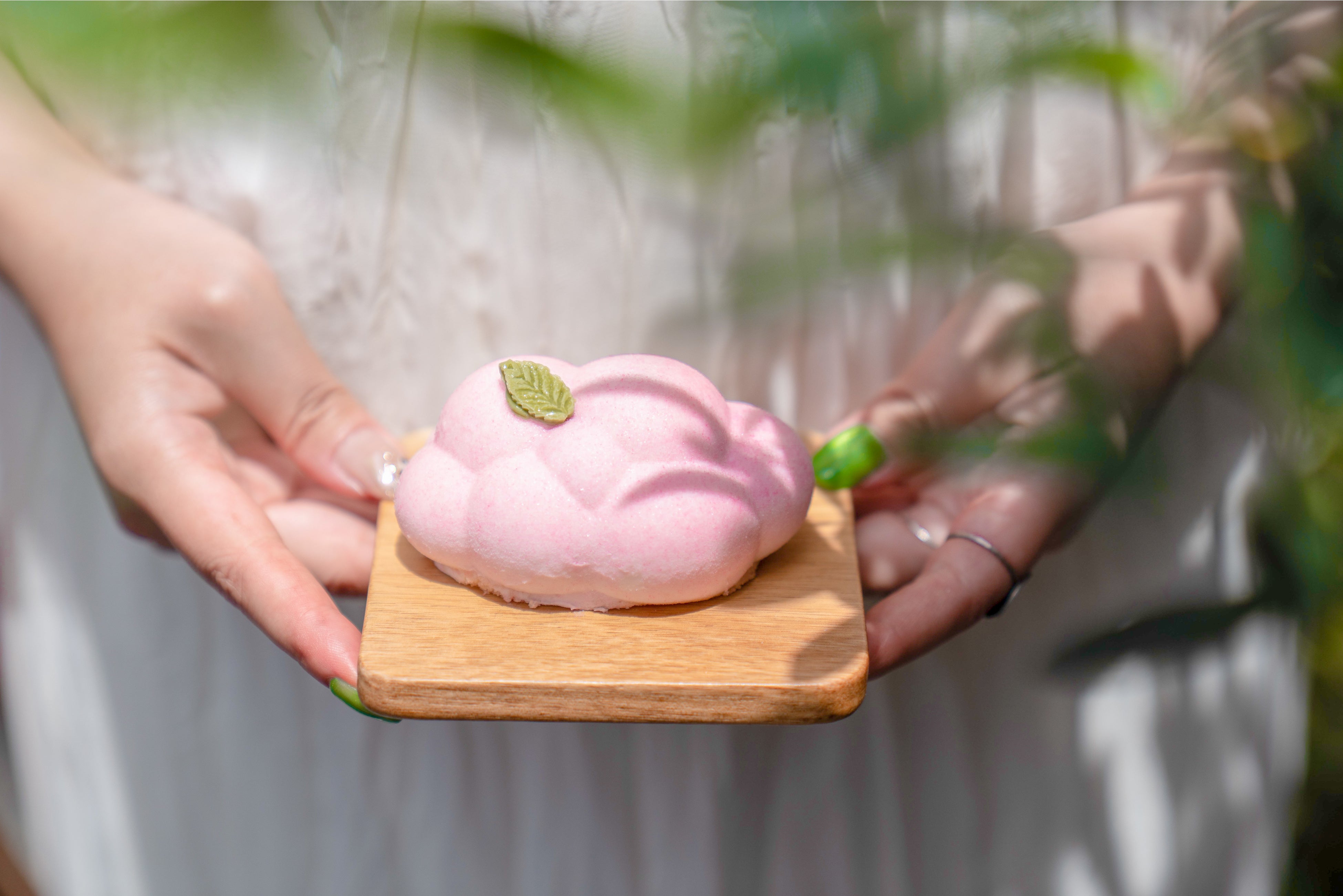 見た目も可愛いらしいピンクの雲、一気に桃を連想させるムースのふんわりとゼリーと桃の食感が楽しめ、柔らかな白桃ムース中を切り開くときれいなに桃の果肉を含んだサンドイッチ+となっており、桃の優しい甘さと烏龍茶の清らかな香り、どれもが互いの味を高め合います。