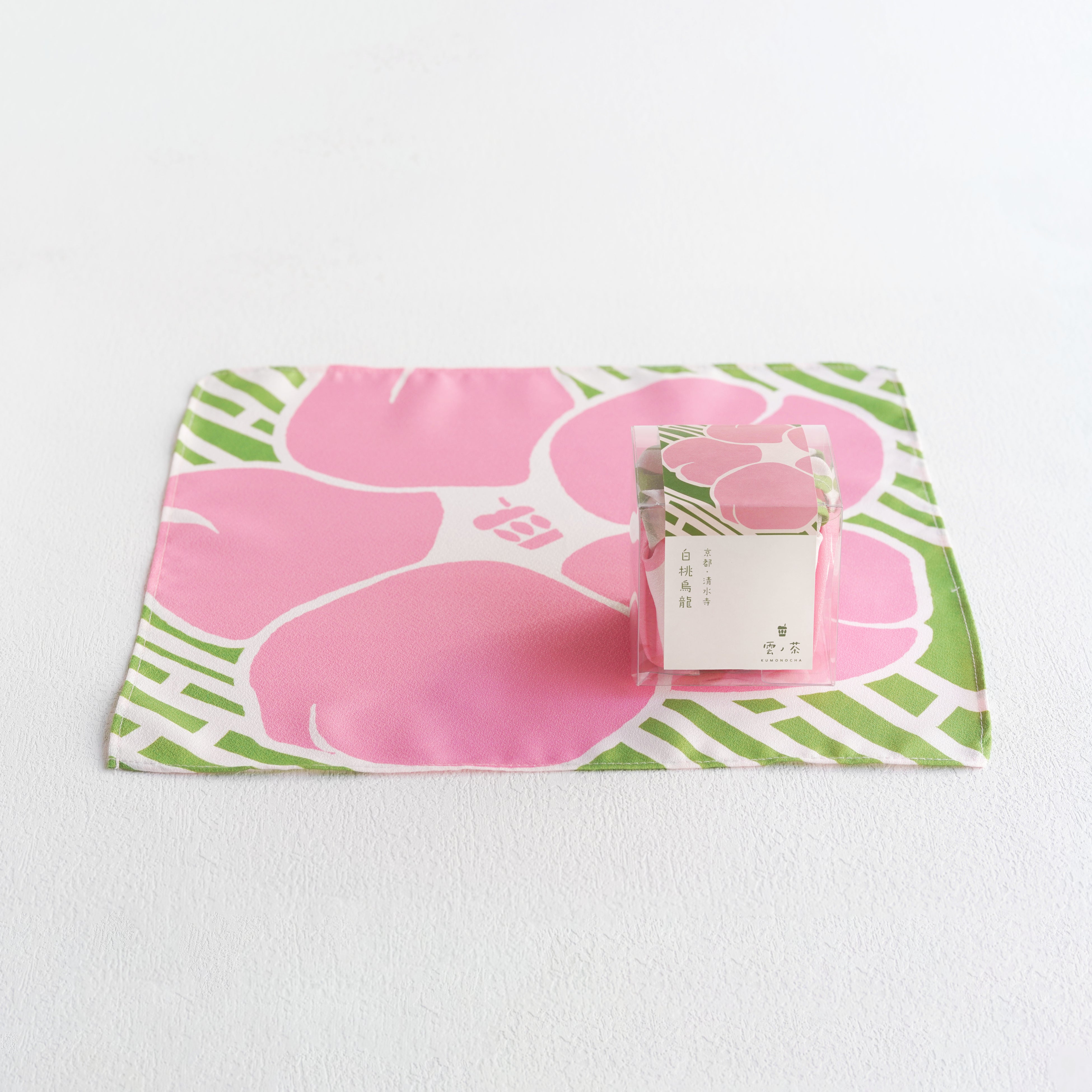 桃の色のように粉っぽい風呂敷に「桃がこころこ桜の坂道」と描かれてあり、一気に清水三年坂を連想させます、風呂敷の中は雲ノ茶が用意した極品白桃烏龍茶葉です。こもれ日の下で、上品な甘い香りに包まれるひとときを!