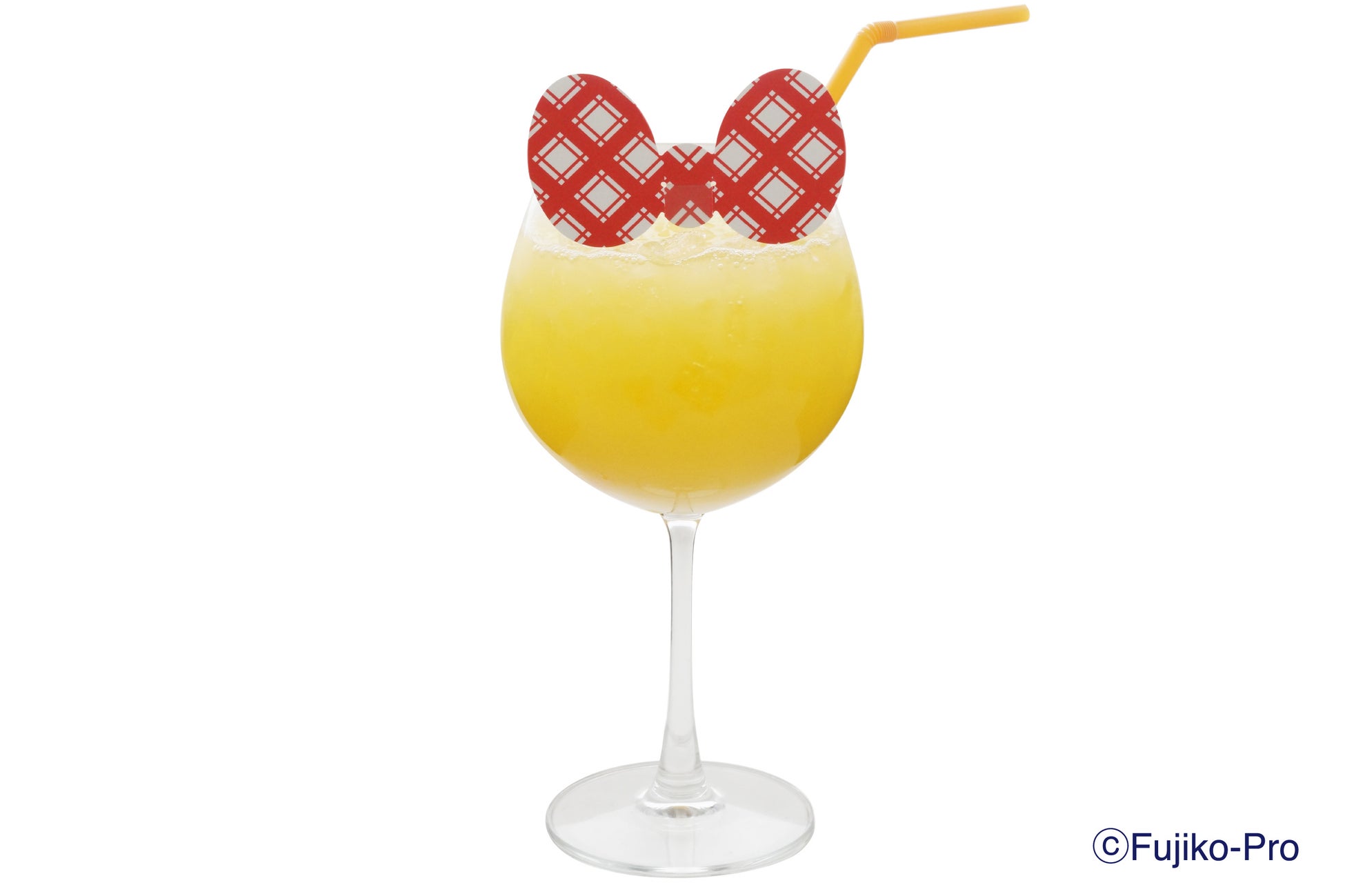 ドラミちゃんのフォルムをイメージした、丸いグラスでご提供するパイナップルとレモンのジュース。ドラミちゃんのリボンつきです。