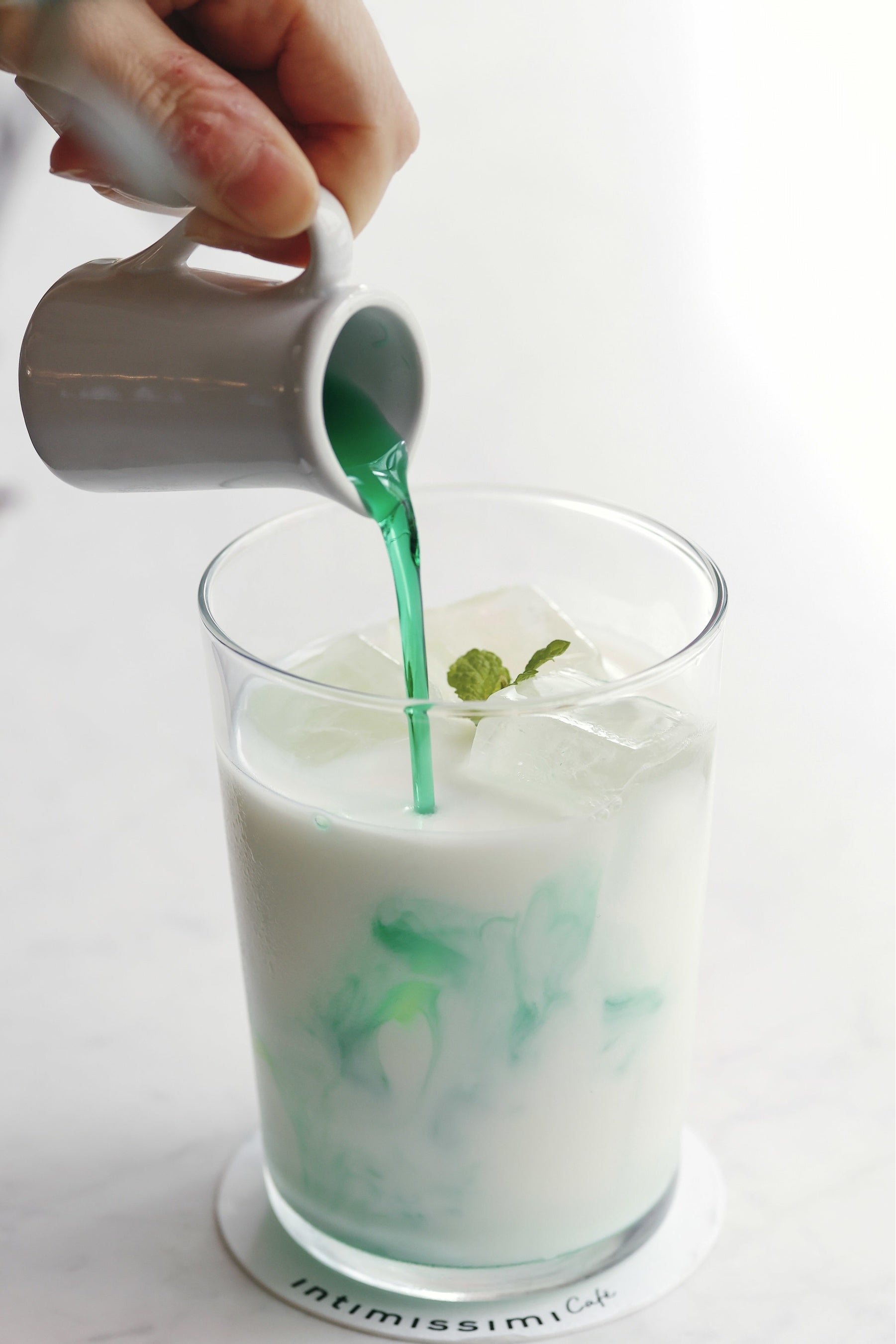 限定メニューとして、インティミッシミのアイコンブラの名前が付いたドリンクもご用意。インティミッシミカフェでしか味わえないスペシャリテドリンクの中でも特にオススメしたい商品が、Latte & Menta(ラテメンタ)。ミルクの中に、ミントのすっきりした味わいが夏の喉を潤します。ミントのブルーが白いミルクに混ざっていく様子が見た目にも可愛い、まさにフォトジェニックなドリンクです。