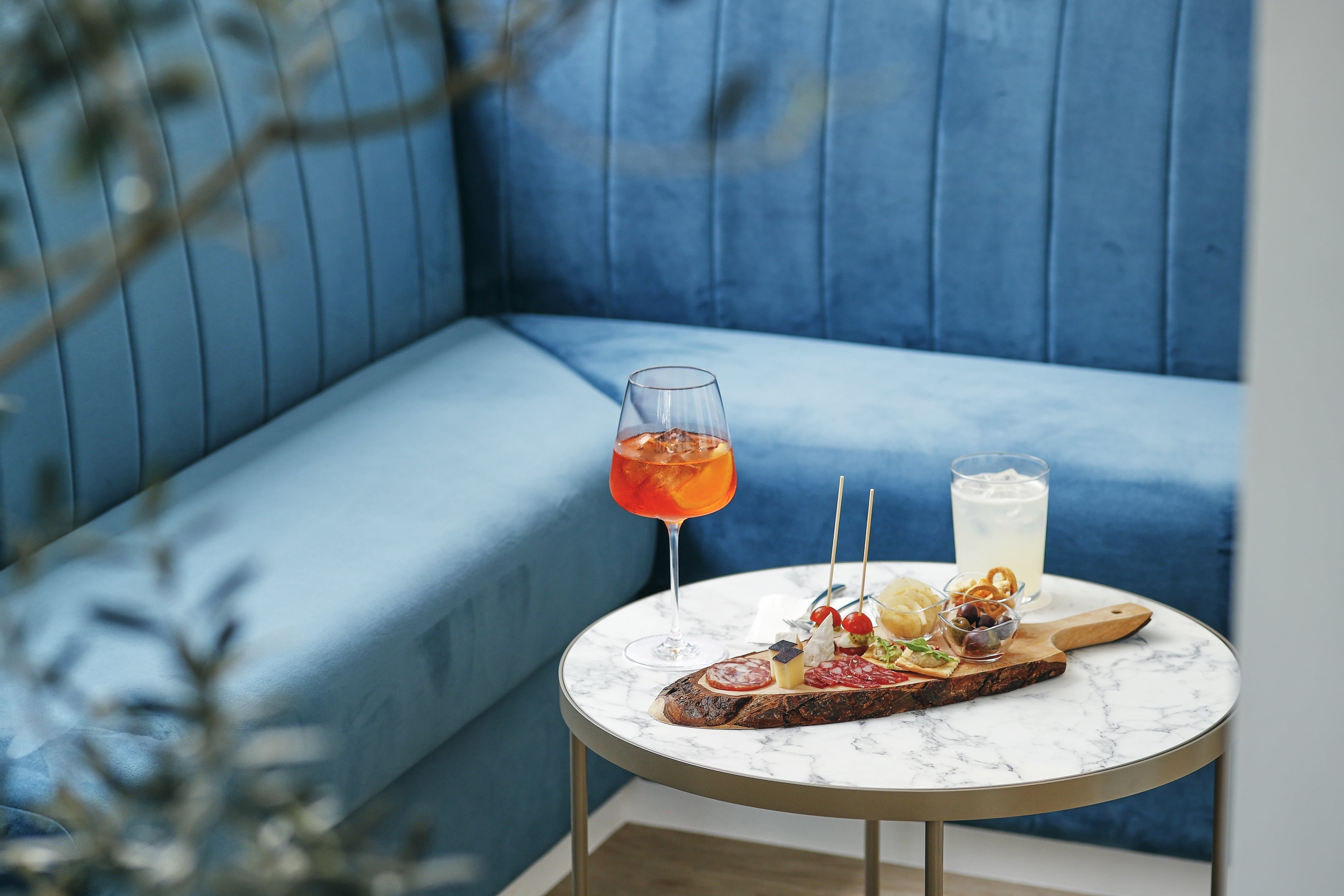 左ドリンク:スプリッツ800円、右ドリンク:レモネード600円、おつまみの盛り合わせ1,600円