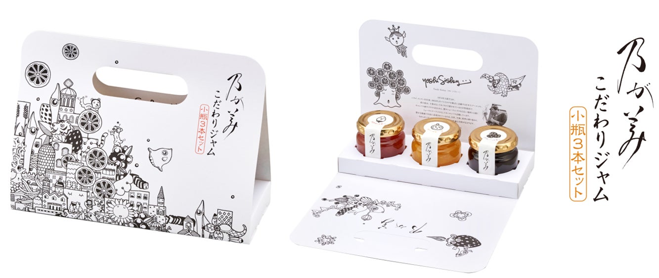 「こだわりジャム小瓶3本セット」は、国産のフルーツのみを使用したストロベリー、マーマレード、ブルーベリーの定番ジャムを1セットにした商品です。元々、3種のジャムは「創業乃が美」の味わいに合うように開発され、長年愛されてきました。今回、日本人ミューラルアーティストYoshi Sislayさんが乃が美のためだけに制作したオリジナルデザインをパッケージにあしらい、プレゼントやお土産にぴったりの商品として生まれ変わっています。
