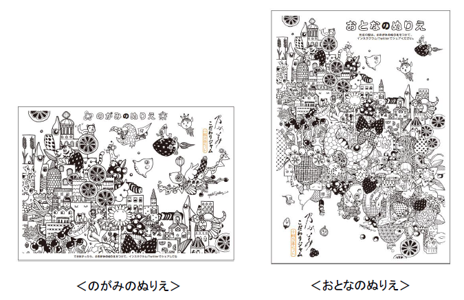 乃が美は、「こだわりジャム小瓶3本セット」の発売日を迎えるにあたり、夏休みのタイミングにあわせてYoshi Sislayさんのわくわくするような世界観をより一層お楽しみいただきたいという思いから、お子さま用に「のがみのぬりえ」と、大人用に「おとなのぬりえ」をご用意しました。自分なりの色で彩っていただくことで、子供の頃にお絵描きをする時のような自由な感覚を思い出してほしい、という思いが込められています。インスタグラム、ツイッターにて「#のがみのぬりえ」というハッシュタグとともに「オリジナルぬり絵」をご投稿いただき、彩り豊かな世界をシェアして楽しんでいただきたいです。