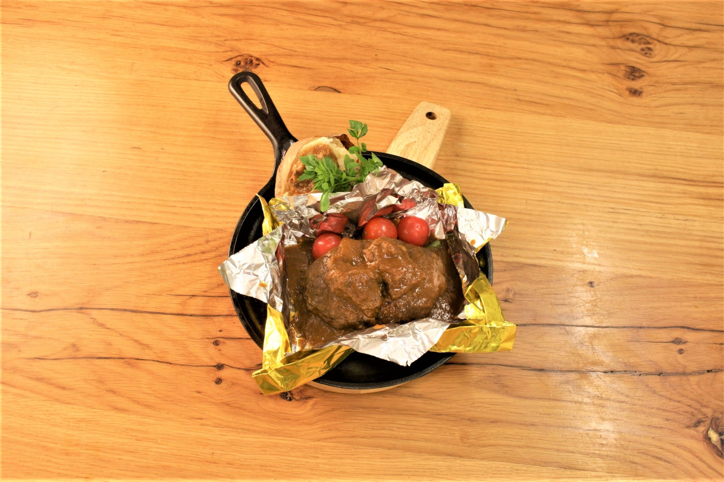 ハンブルグステーキに食欲をそそる自家製「欧風カレーソース」をかけ、金色のホイルで包み焼きにしました!