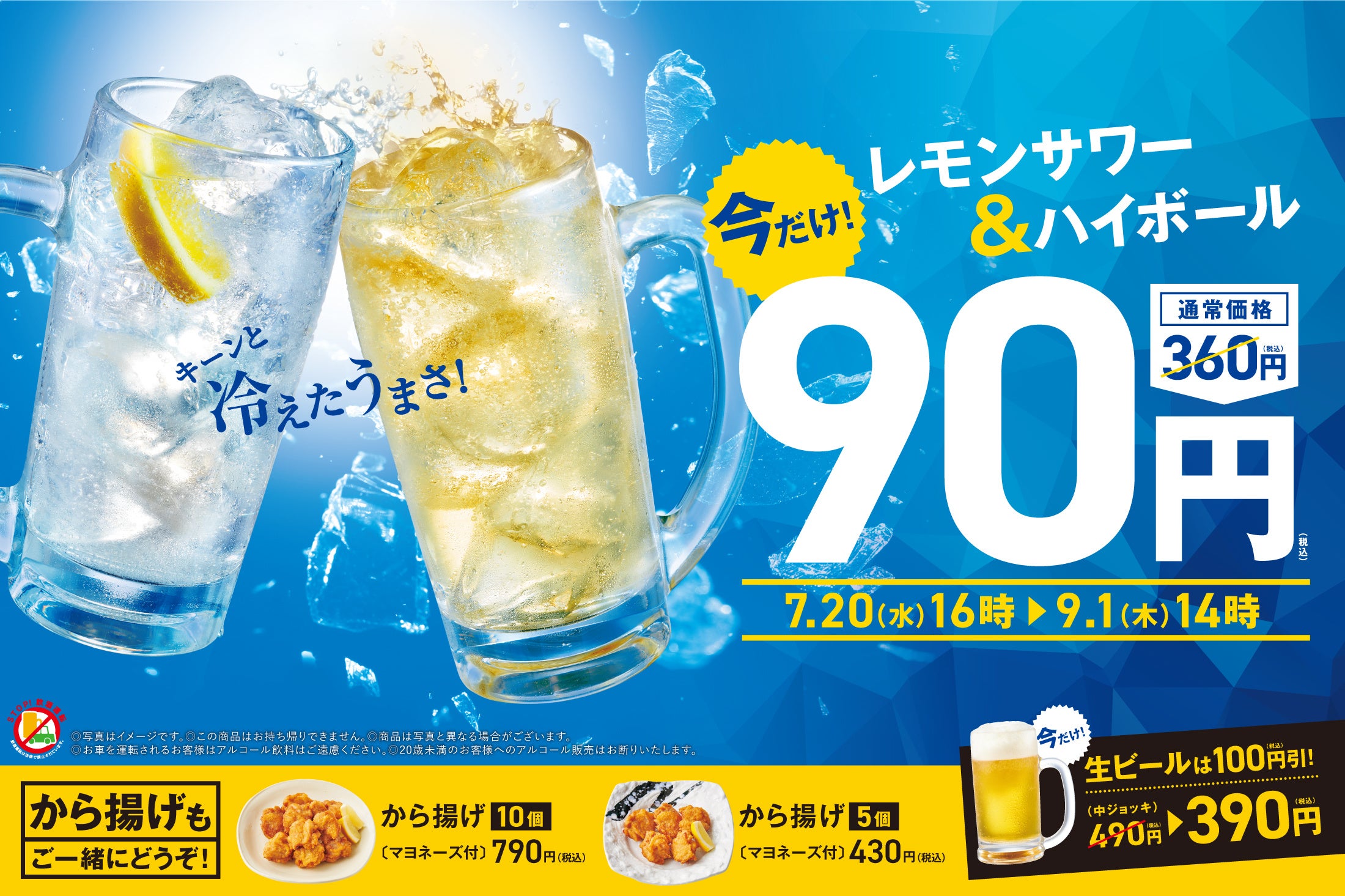 株式会社プレナスは、定食レストラン「やよい軒」を、2022年6月末現在366店舗展開しております。このたび「やよい軒」では、大人にも子供にも喜んでいただける夏休み限定のキャンペーンを実施いたします。7月20日(水)16時より9月1日(木)14時までの期間限定で、暑い日に嬉しい『レモンサワー』、『ハイボール』を90円、『生ビール』を通常価格より100円引きの390円で販売いたします。また、キャンペーンに合わせてアルコールと相性の良い『から揚げ(5個)』430円と『から揚げ(10個)』790円を、新発売いたします。