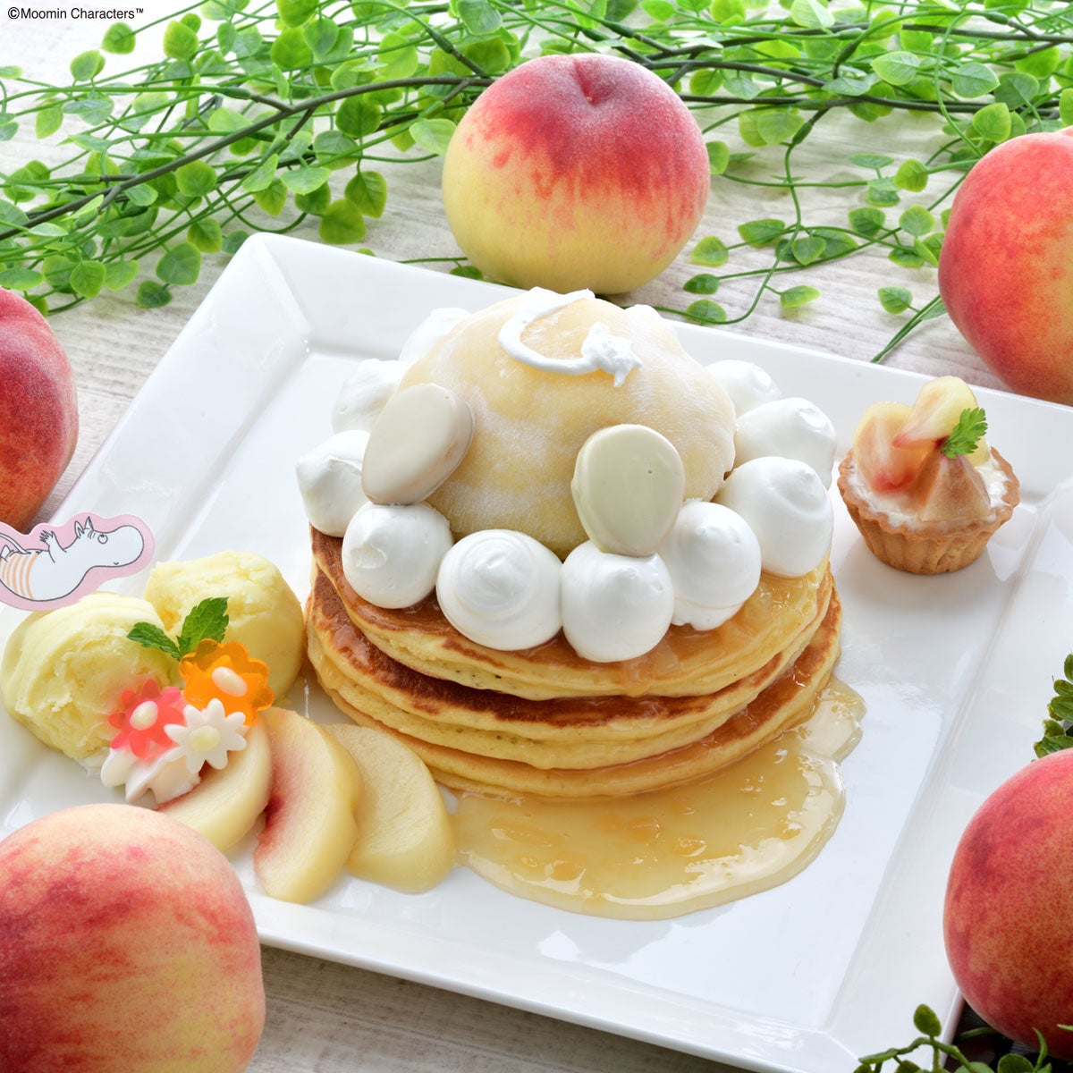 ムーミンカフェの人気メニュー、オリジナルレシピのパンケーキと季節の果実、白桃をお楽しみいただける「まんまるおしり もも杏仁プリンパンケーキ」が夏の期間限定メニューとして登場いたします。