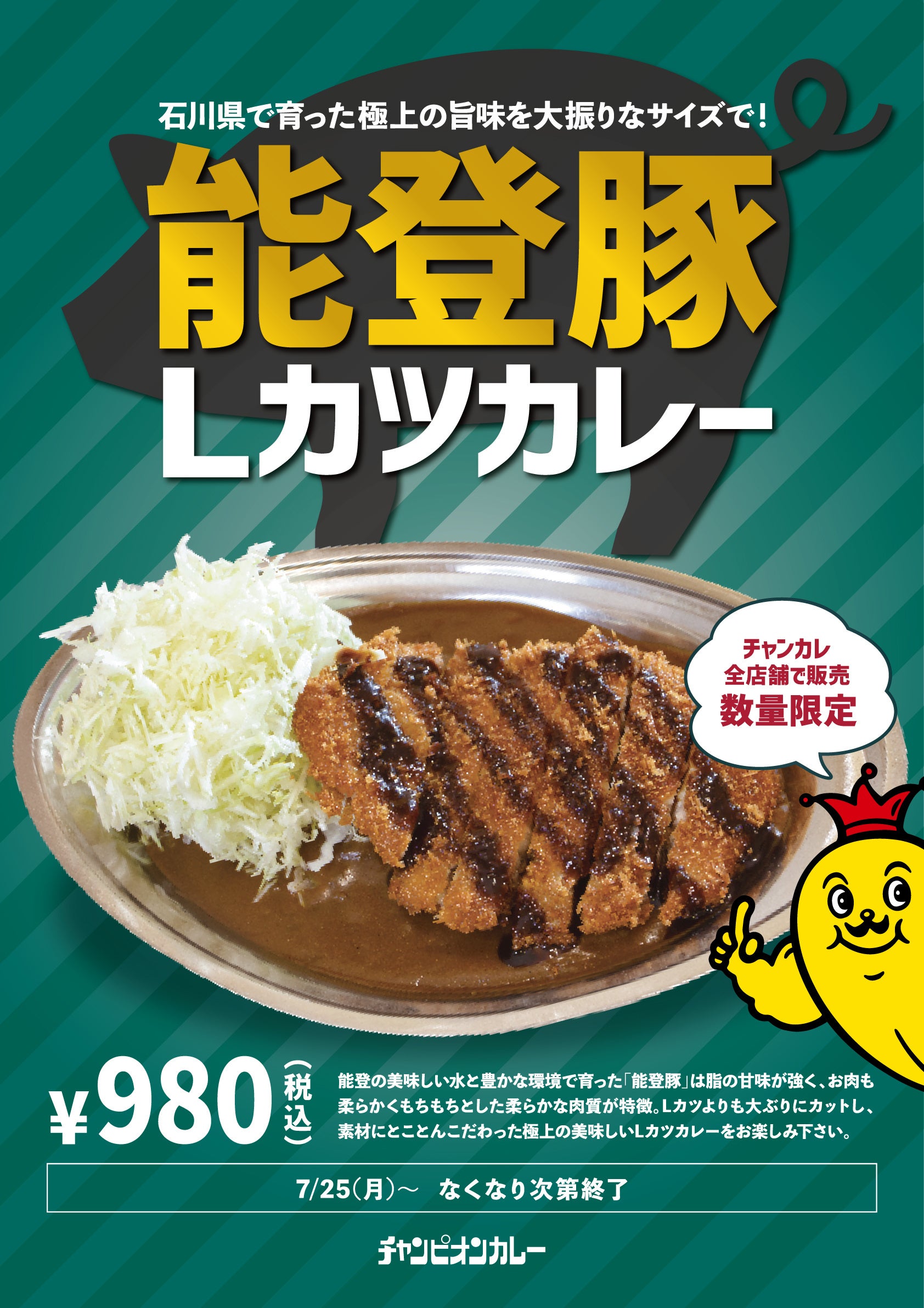 前回驚異的な売上を見せた限定メニューの再販。用意した8850人前をあっという間に売切り、最終的には発注先に「もう在庫がない!」と言われた能登豚Lカツカレー。前回食べられなかった方にも是非食べて頂きたい!との想いから今回は1万食分ご用意いたしました!さらに、限定メニューでは初めて全店舗で販売。お近くのチャンカレに行っていただければお召し上がりいただけます。ドロっと濃厚なカレーソースと極上の能登豚の出会い。カツと金沢カレーの相性の良さは「Lカツカレー」でみなさまにご存じ頂けているかと存じますが、カレーの旨みが能登豚の脂の甘さをさらに引き立てます。Lカツより大きめ&厚めの能登豚カツで特に暑いと言われている今年の夏を元気に乗り切っていただきたいです!