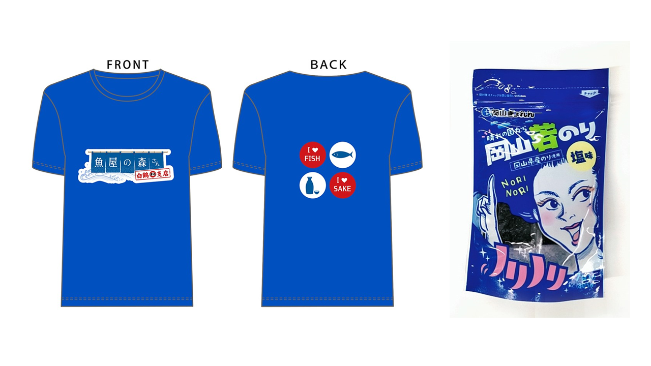 白鶴酒造の公式Twitterをフォローし、対象ツイートをリツイートされた方の中から、「魚屋の森さん 白鶴まる支店の特製Tシャツ」と、JF全漁連が運営するECサイト「JFおさかなマルシェ ギョギョいち(※3)」で販売している「晴れの国から岡山若のり」をセットにして抽選で10名様にプレゼントします。