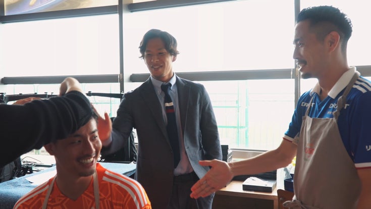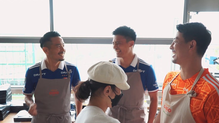ホームタウンでもある横浜の“横浜野菜”とオイルを使用した料理対決を実施。普段はボランチとしても活躍する背番号24(=ニッシン)岩田智輝選手がMCで、撮影でも見事なパスで会話をコントロールしましたが、突然沈黙となり笑いを誘う場面も。