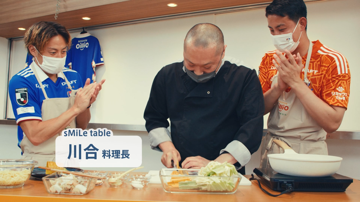 ゲストの栗原勇蔵クラブシップ・キャプテンからのリクエスト「地元横浜野菜を使った試合前に食べたくなる料理」で、水沼宏太選手、宮市亮選手が組んだ“水&宮チーム”、仲川輝人選手、高丘陽平選手が組んだ“仲&高チーム”に分かれて対決。普段選手たちが練習後に食事をする「sMiLe table」で、川合料理長のサポートを受けながら料理を作りました。