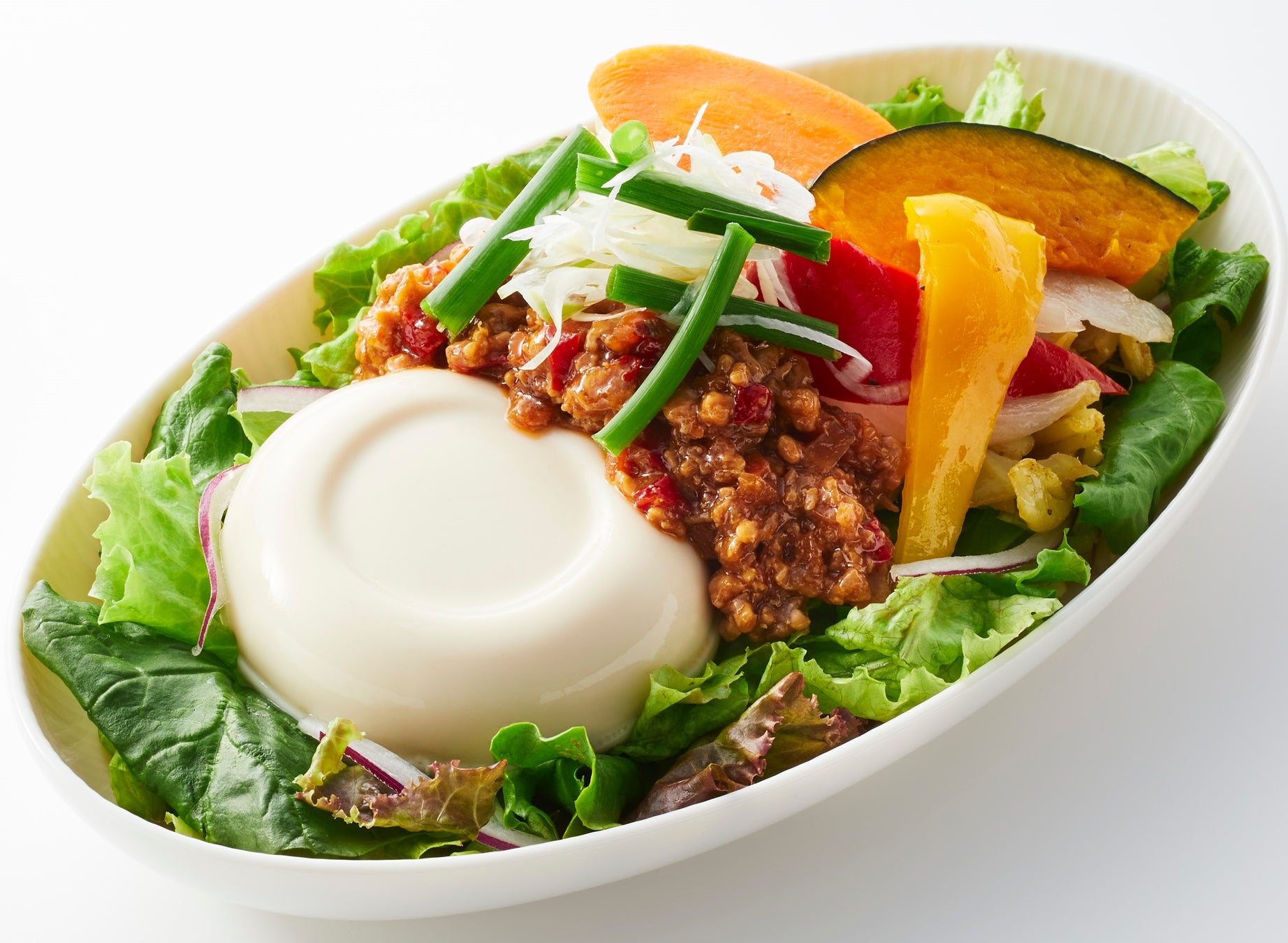 豆腐まるまる1個と野菜を、ご飯にも合う肉味噌でもりもり食べるおかずサラダ。コクのある肉味噌が豆腐にも野菜にも相性抜群の美味しさ。