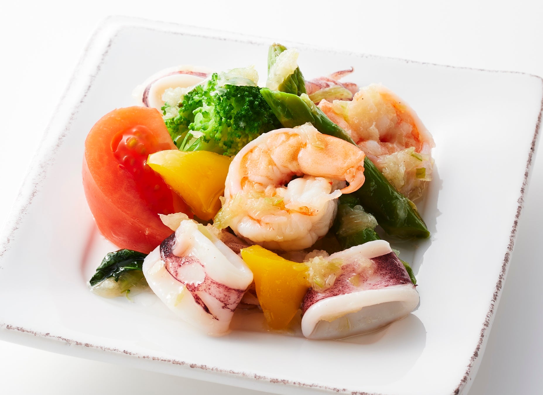 ぷりぷりの海老とイカの旨味に、アスパラガスなどの野菜の組み合わせ。ほのかな生姜風味の葱塩ソースで、ご飯にもビールにもピッタリのおかずサラダ。