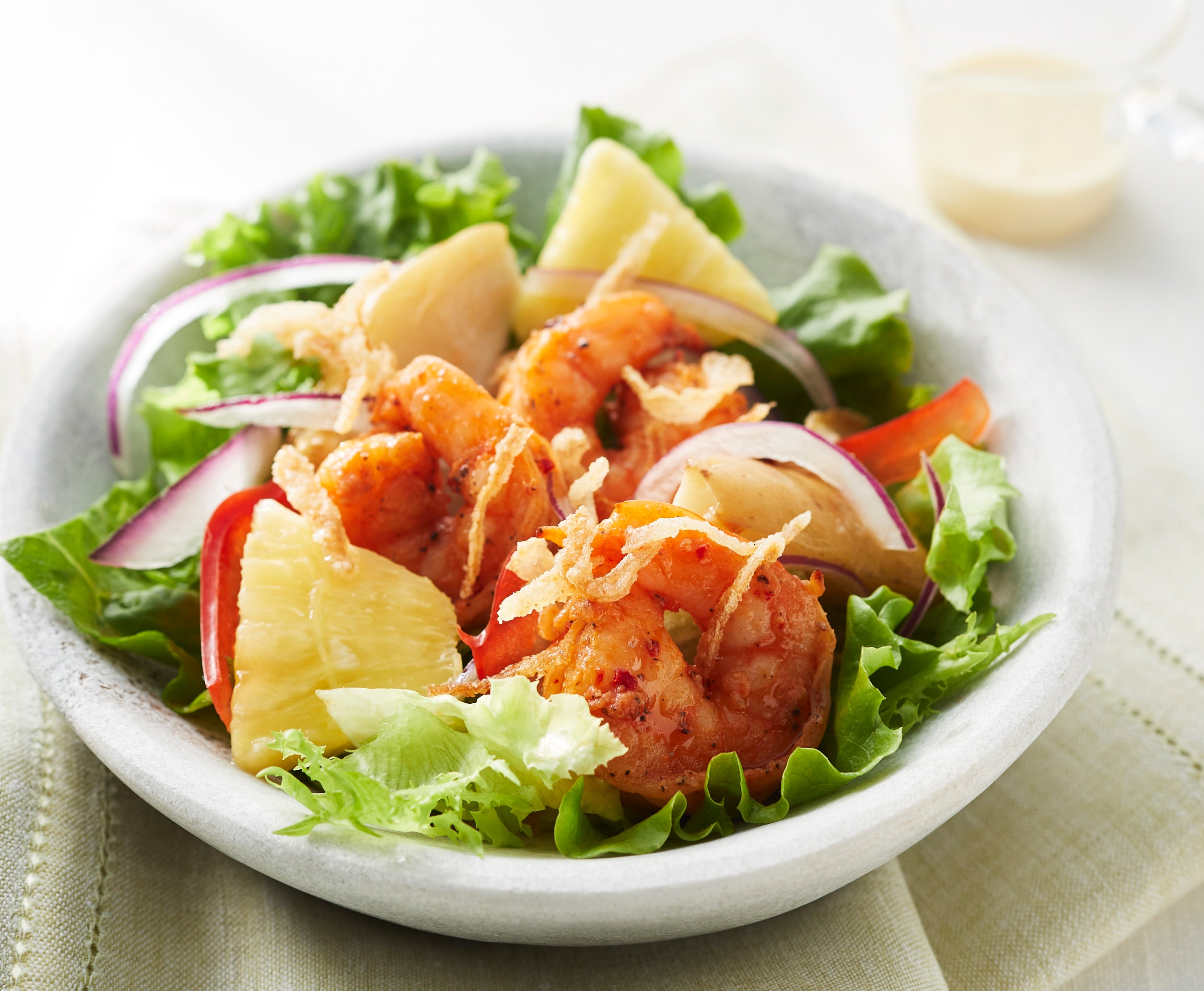 ハワイの定番メニュー「ガーリックシュリンプ」をサラダ化した商品。ガーリック&スパイスとフライドオニオンの旨みがやみつきの味わいです。