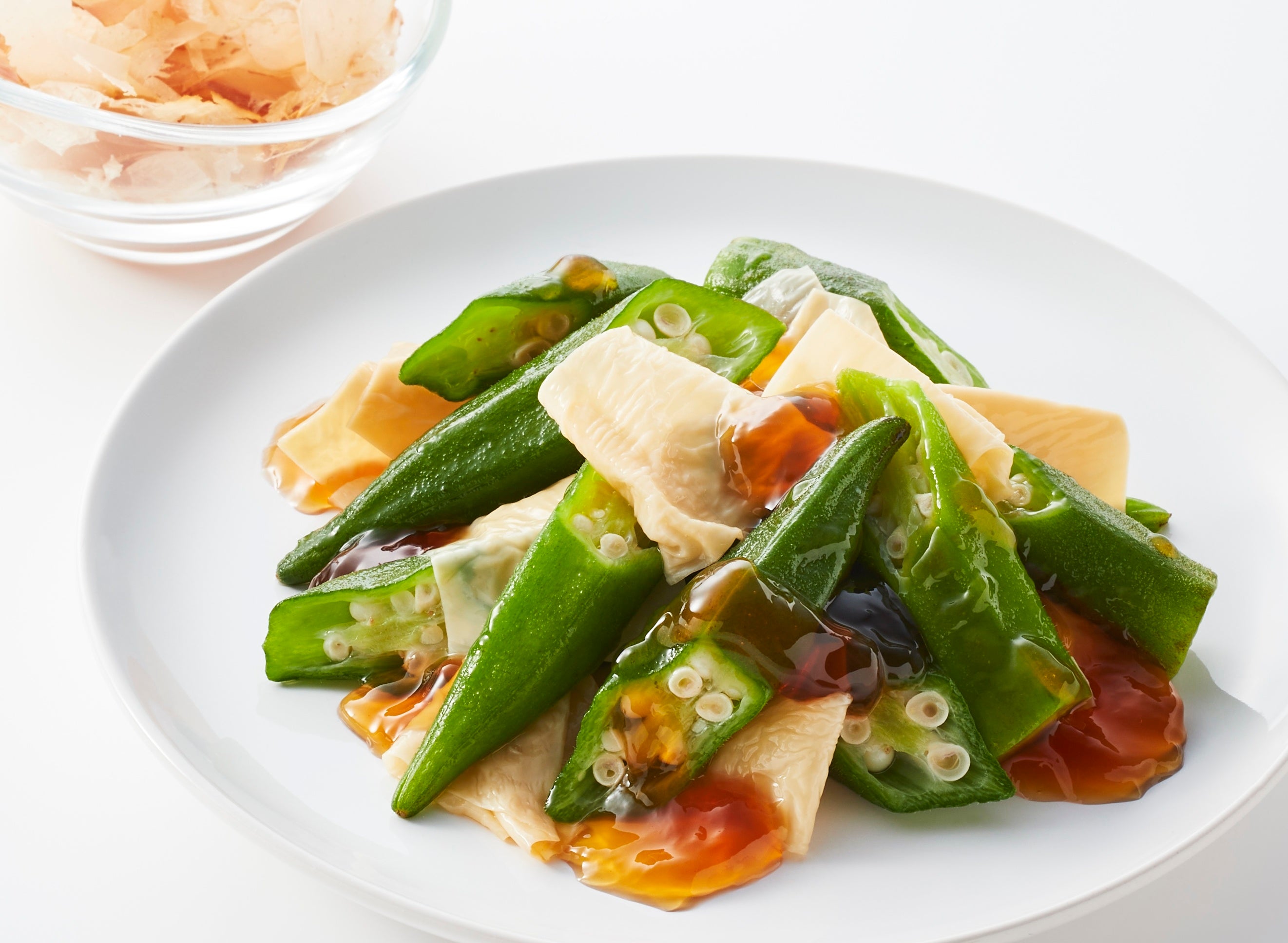 ねばねばオクラと国産大豆を使用した生湯葉の組み合わせ。かつおと昆布の味を効かせたジュレが淡白な味のオクラと相性抜群。かつお削りぶし付き。