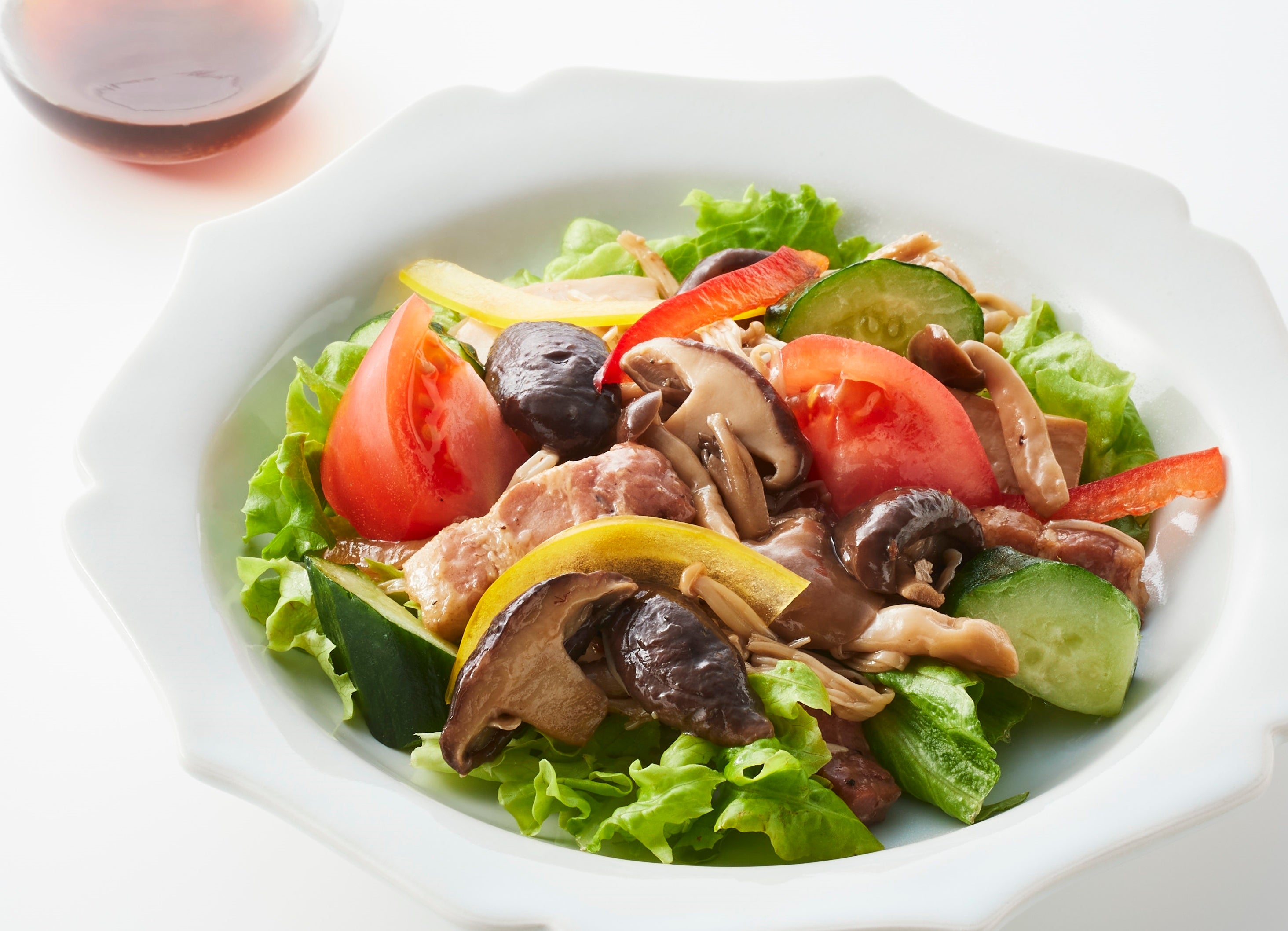 エリンギ、しいたけ、ぶなしめじなど5種のきのこをベーコンと一緒にソテーし、香りをしっかり引出しました。みずみずしい野菜とともに、和風ガーリックソースで楽しむサラダ。