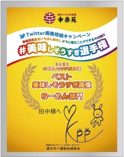賞品について:各部門のベスト美味しそうすぎ画像には幸楽苑CKOきゃりーぱみゅぱみゅサイン入り記念品など