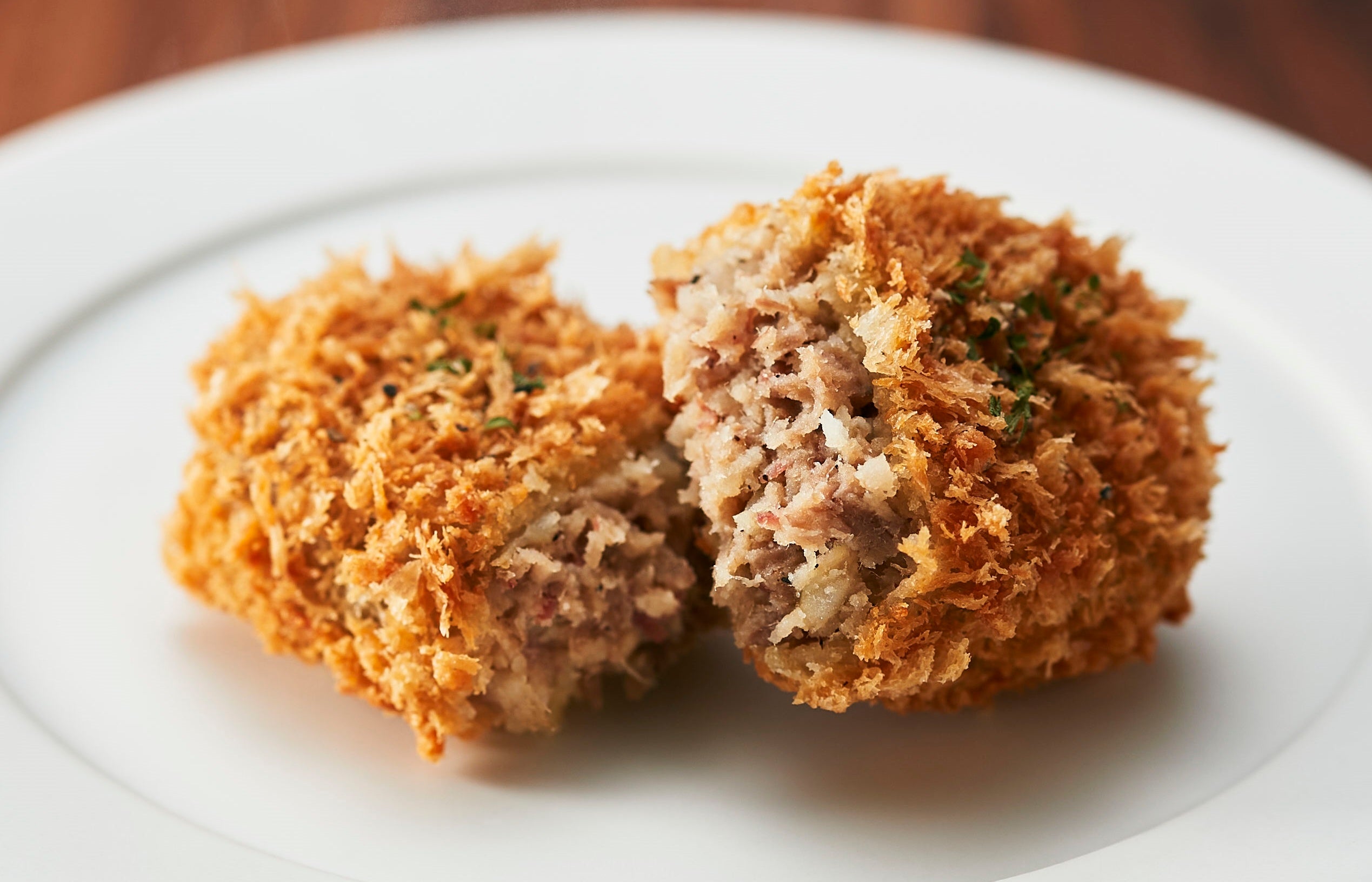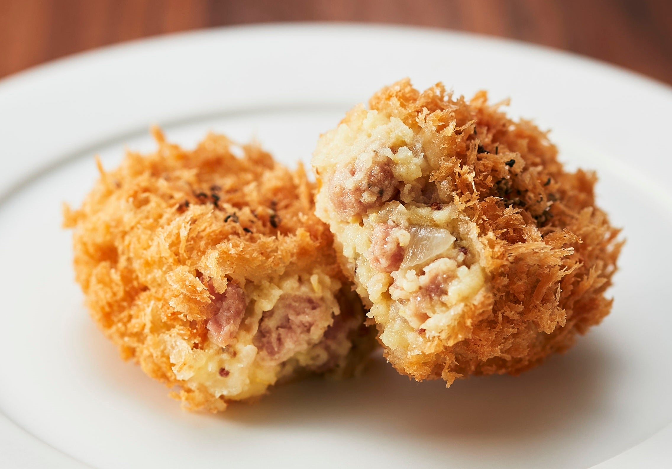 じゃがいも、ソーセージと相性のよいマスタードをガツンと効かせたコロッケです。口に入れた時の味のバランスを考え、具材の割合や俵型の形状にもこだわった一品。