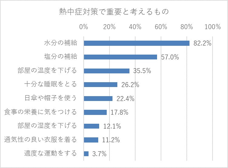 半数以上の方が「水分の補給」と「塩分の補給」を熱中症対策として重要視していることが分かりました。