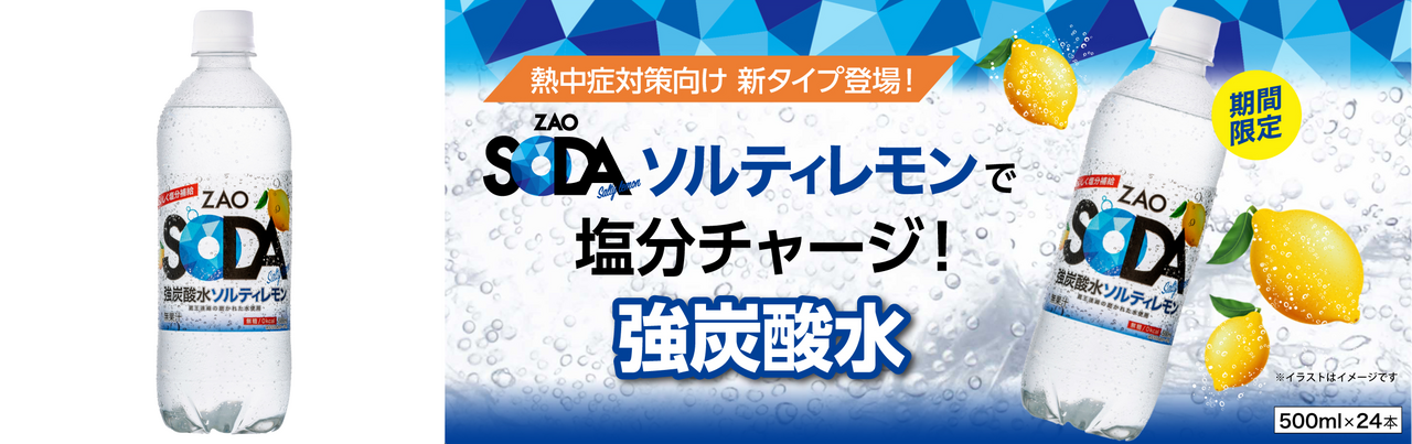 無糖炭酸水×レモンフレーバー×ソルトで、熱中症対策に適した商品設計(※1)がされた「ZAO SODAソルティレモン」は、スッキリとした味わいとさわやかな清涼感で、水分と塩分を同時に補給する夏季限定の炭酸水です。